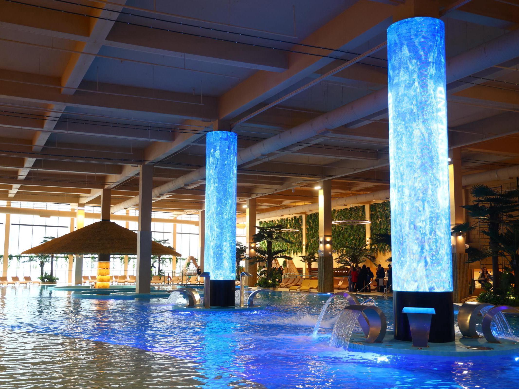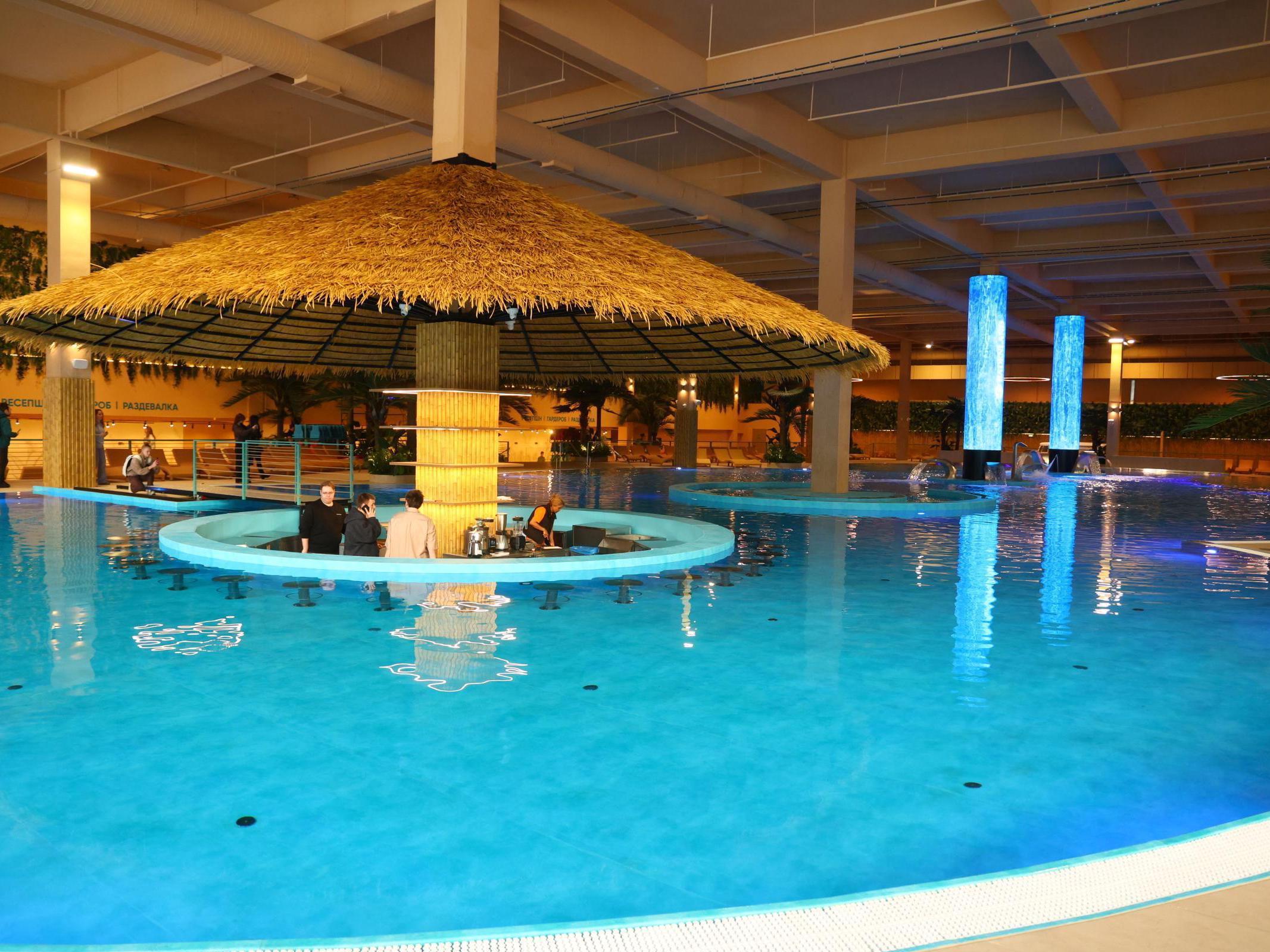 The water body is equipped with a five-stage purification system. In the center of the pool, two large screens have been installed, where images of a waterfall or fiery lava are broadcast at different times of the day. Soon, a pool bar will open at the edge, and nearby, a bus-style bar and a cafe will appear.