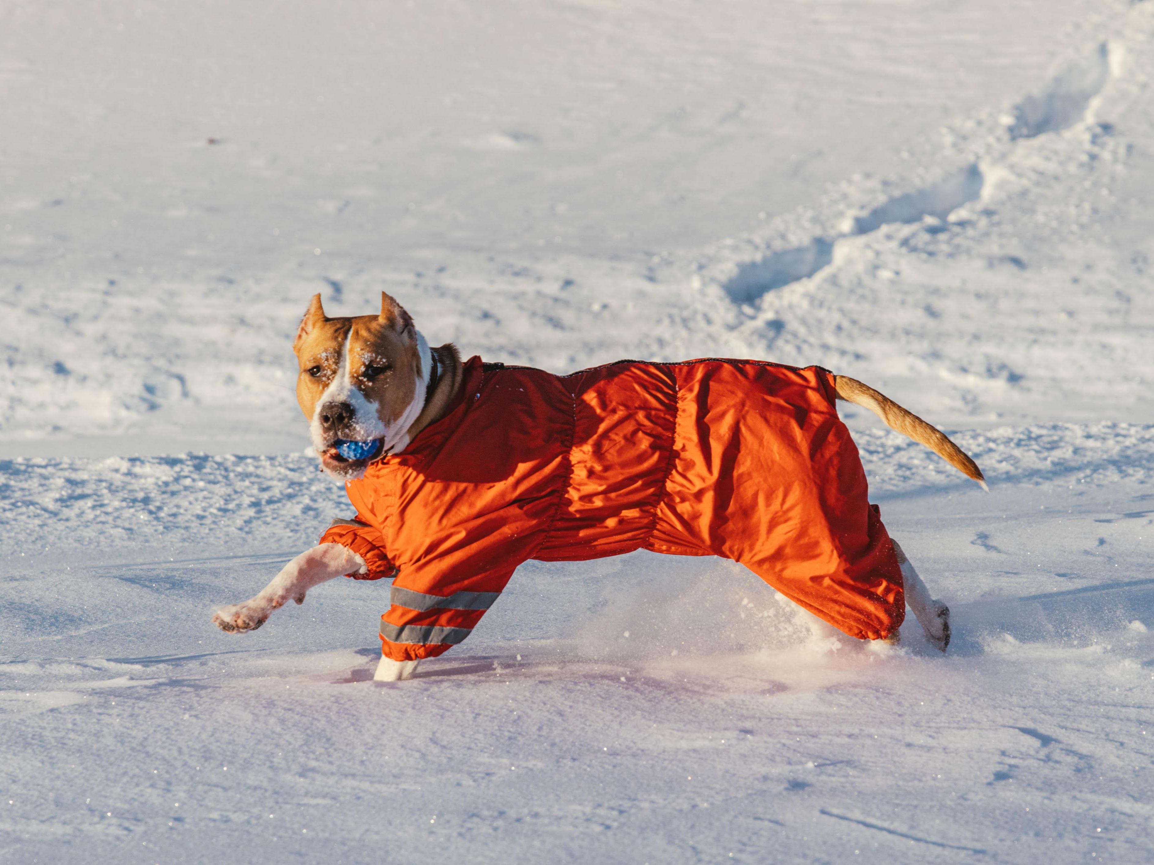 Dogs in jackets enjoy running through the snowy drifts.