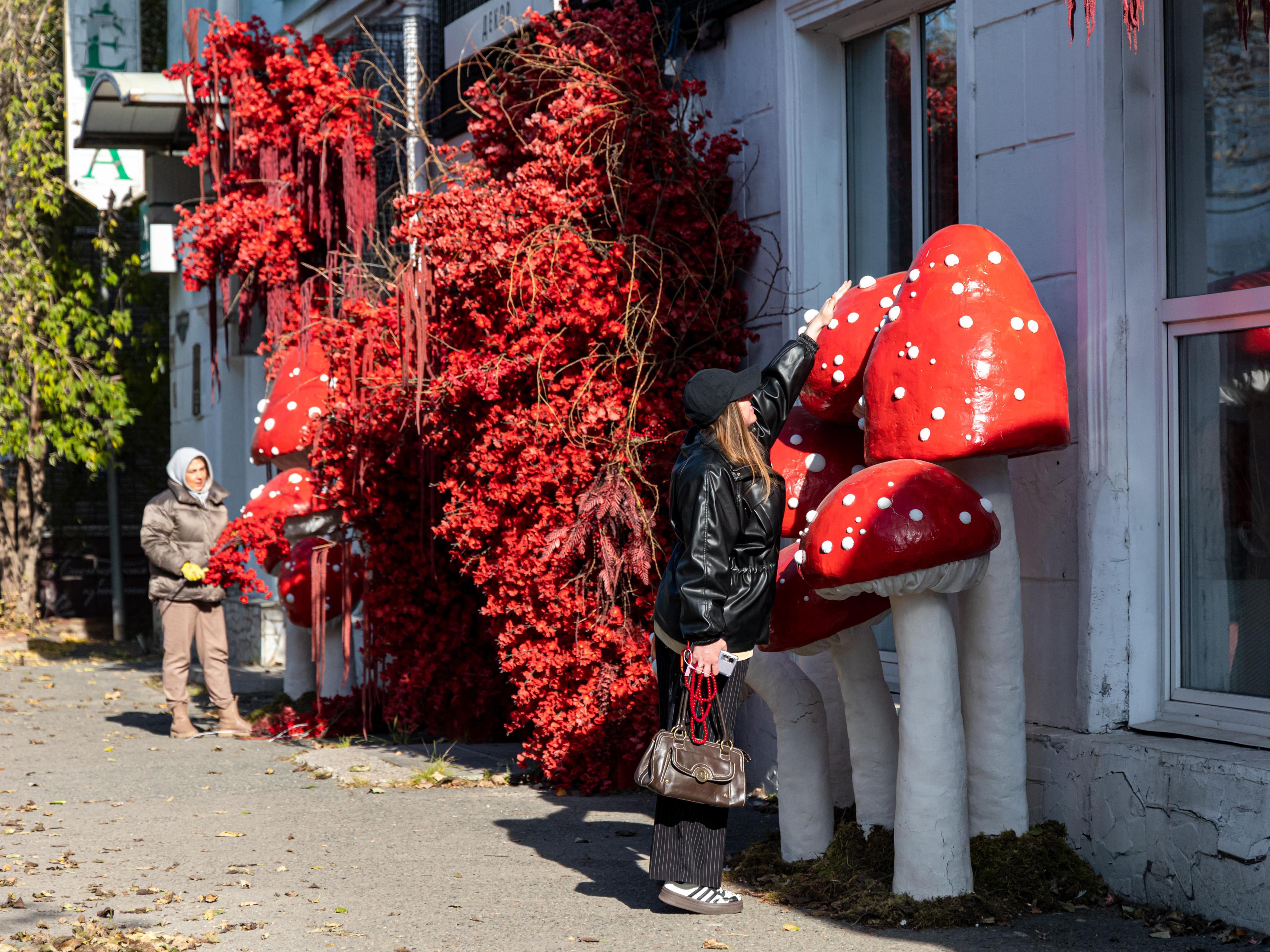 According to the salon director Ksenia, she came up with the idea to place fly agaric mushrooms at the entrance herself, but she slightly borrowed the idea from foreigners.