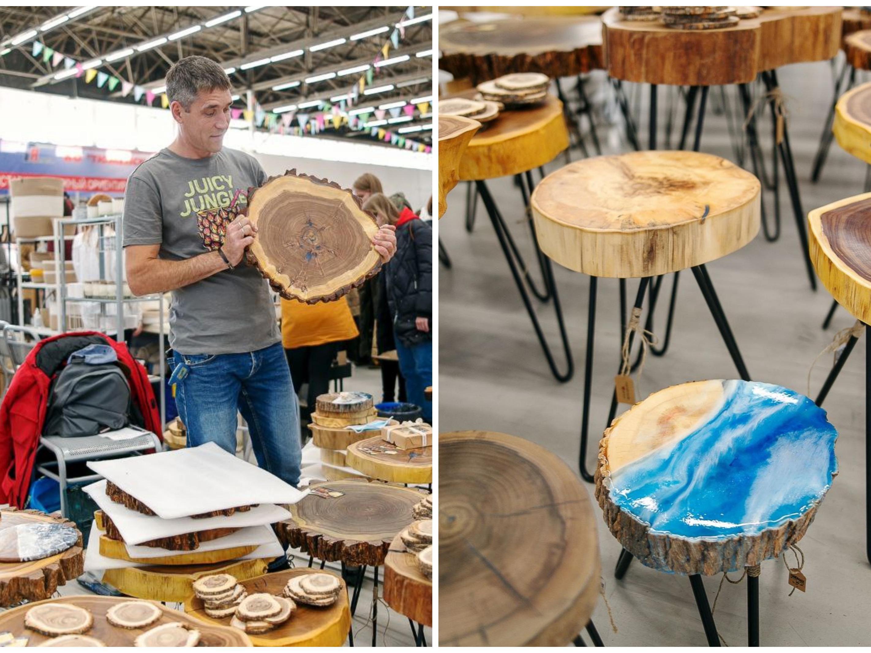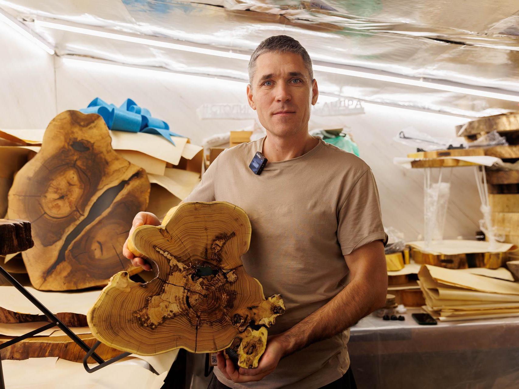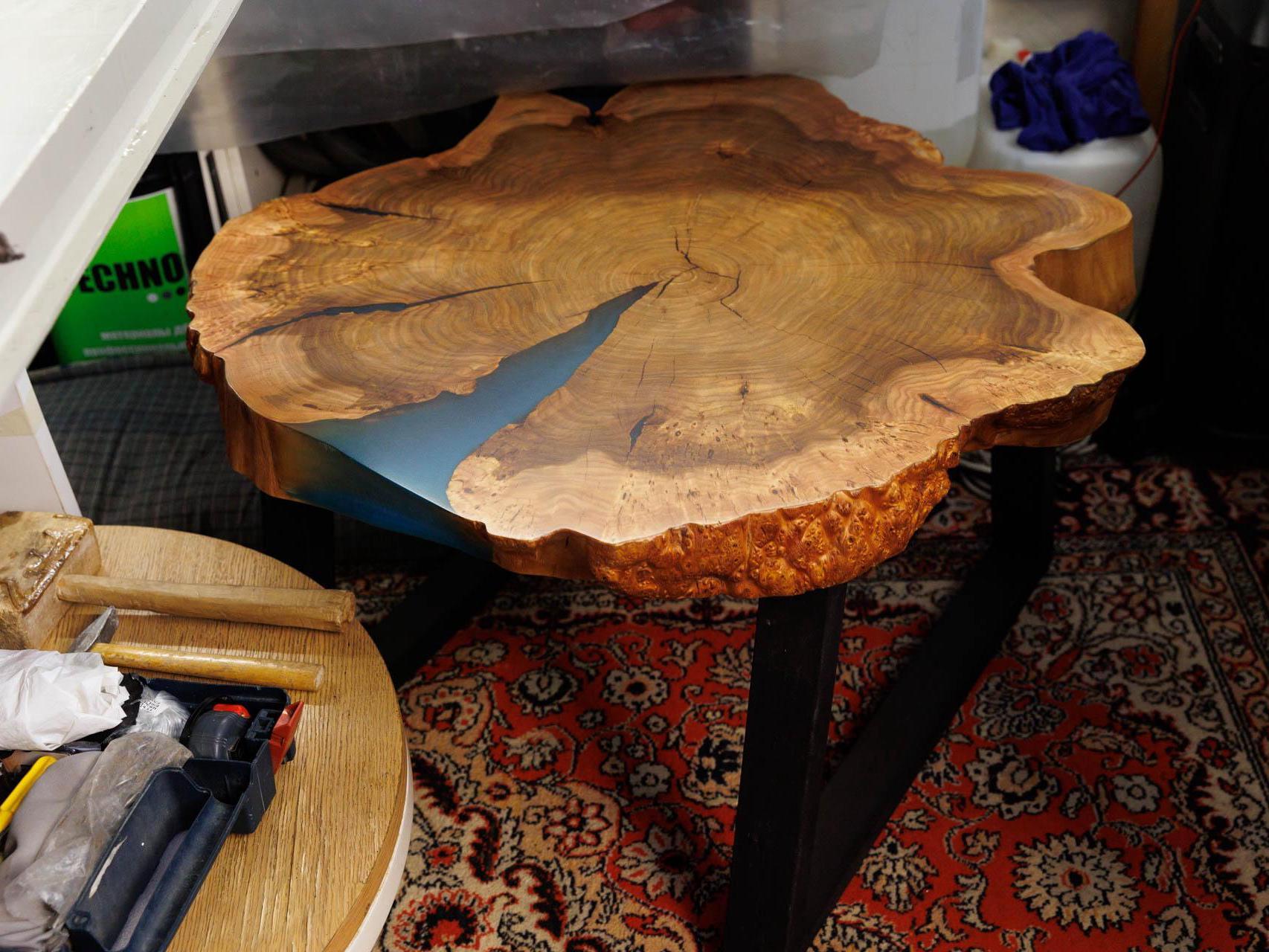 In his work, the master woodworker uses valuable wood species — American walnut, apricot, acacia, and karagach (also known as elm). The material for future tables is brought to Tyumen from Southern Kazakhstan, Dagestan, and Astrakhan. He also needs to regularly replenish supplies of oils and epoxy resin.