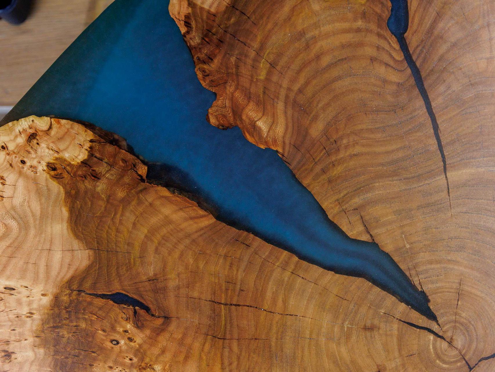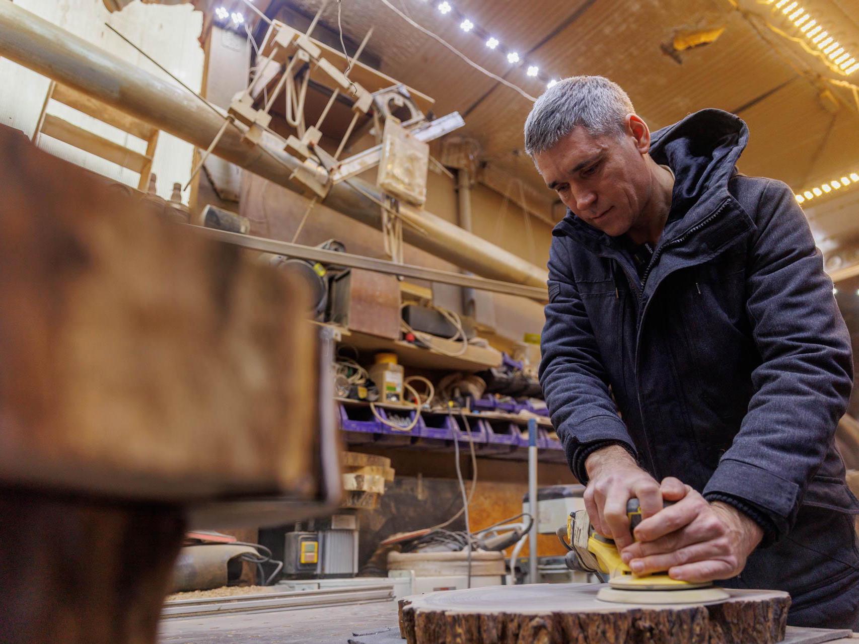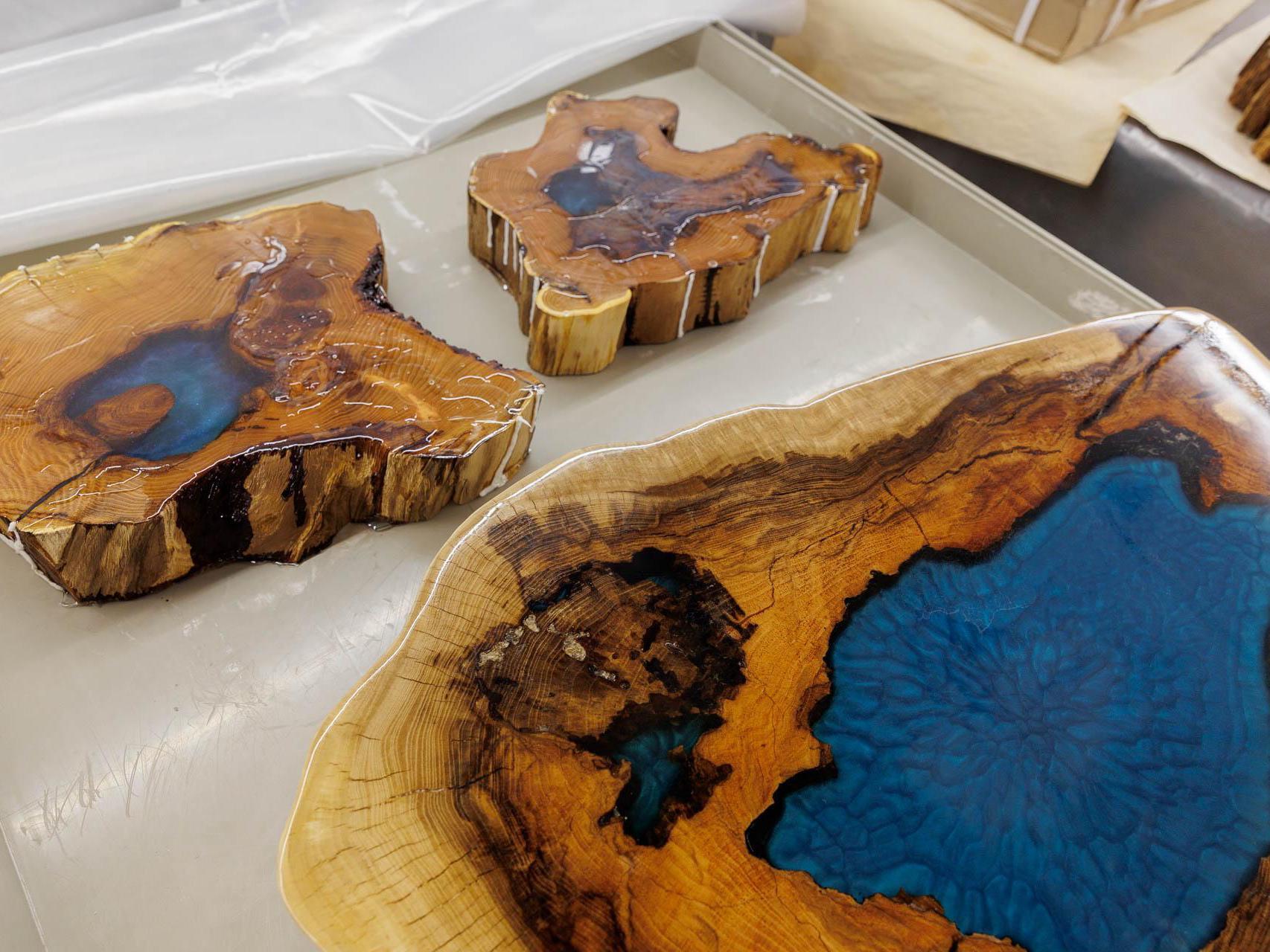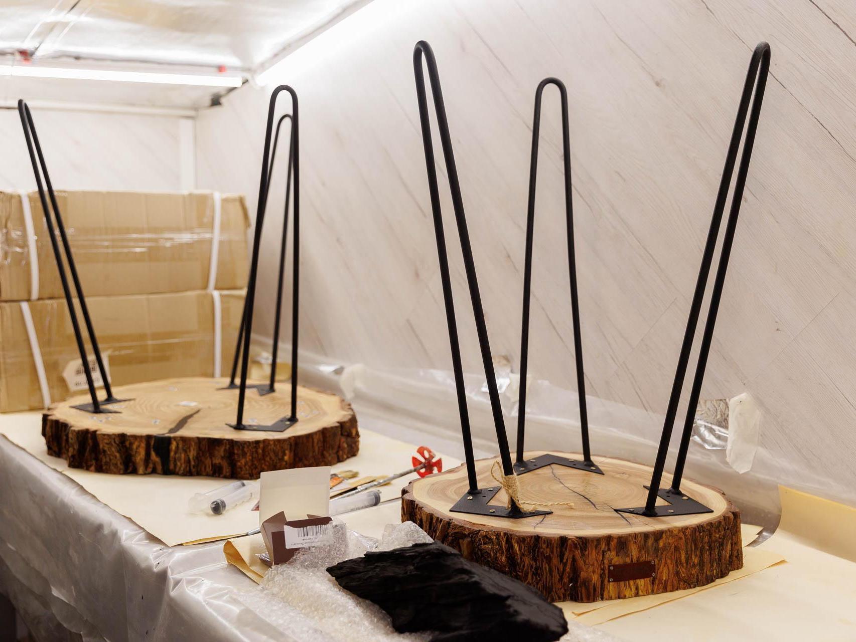 In his work, the master woodworker uses valuable wood species — American walnut, apricot, acacia, and karagach (also known as elm). The material for future tables is brought to Tyumen from Southern Kazakhstan, Dagestan, and Astrakhan. He also needs to regularly replenish supplies of oils and epoxy resin.