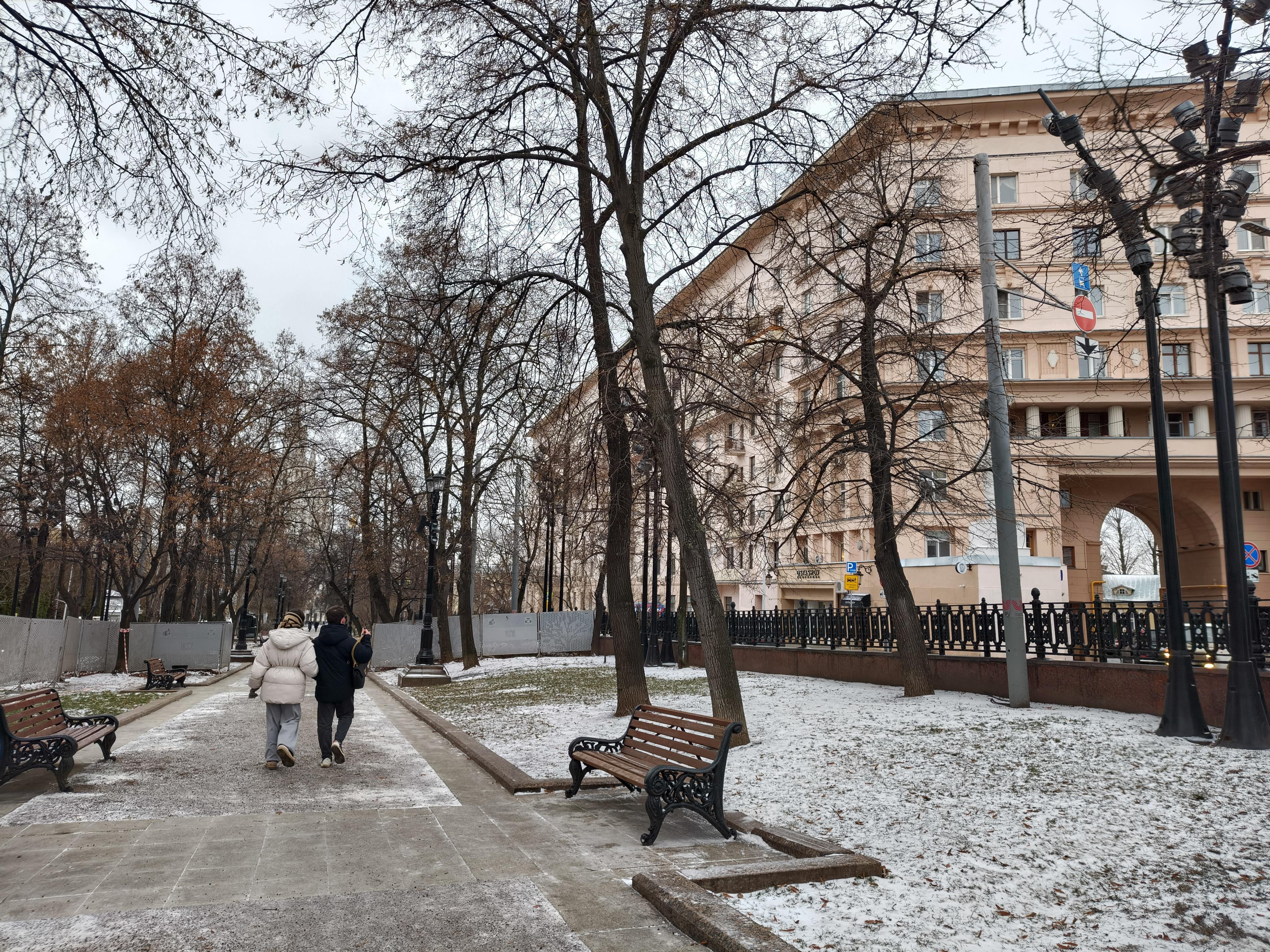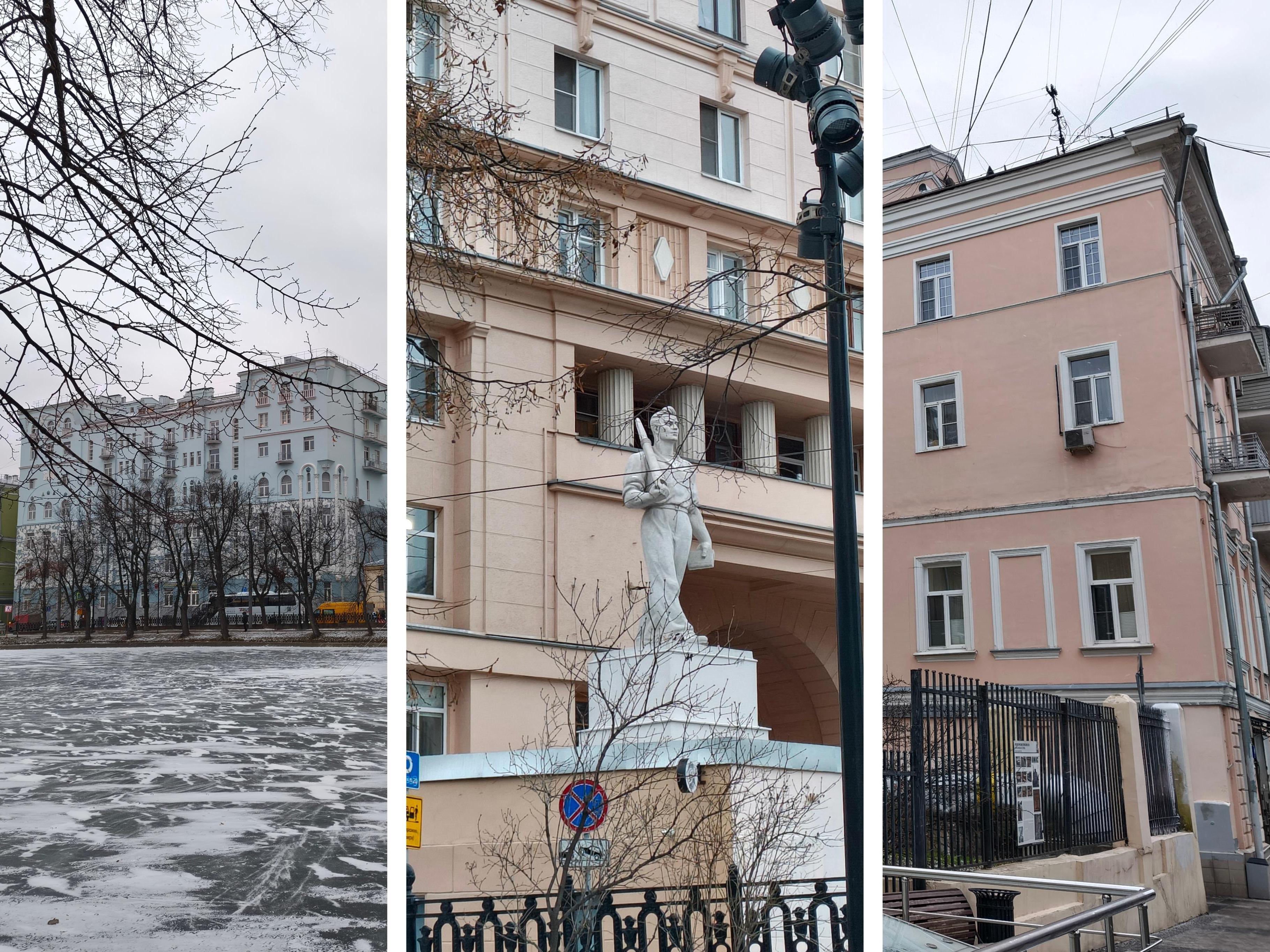 After a shootout with Belkin«s men, Danila and Viktor manage to break away from the chase and find themselves on a quiet street running alongside old buildings. In the frame is a pre-war 1930s building with an arch and sculptures of a worker and a female collective farm worker, a characteristic example of early Stalinist Empire style. In the background appears the skyscraper on Kotelnicheskaya Embankment — one of the symbols of post-war Moscow.