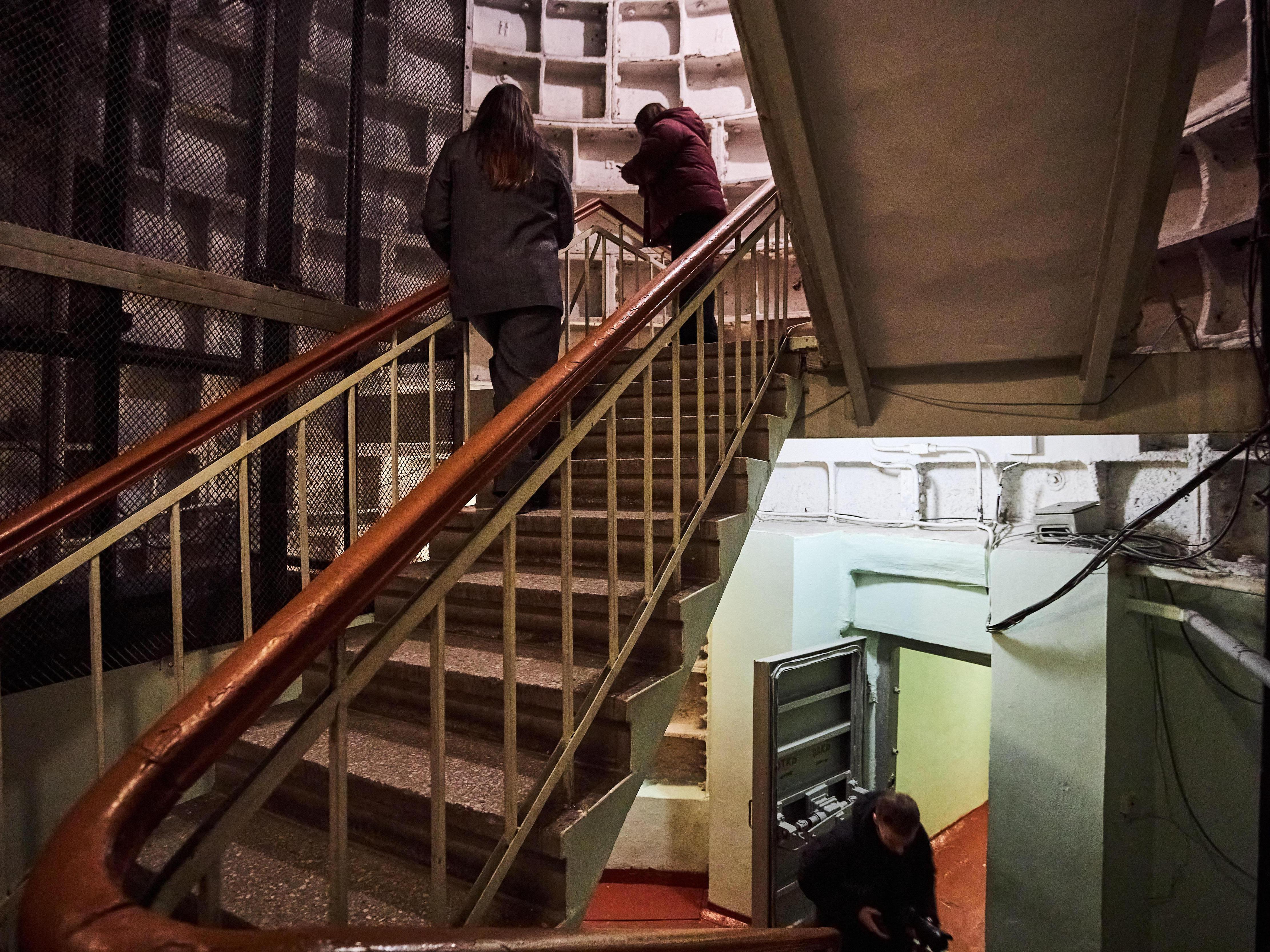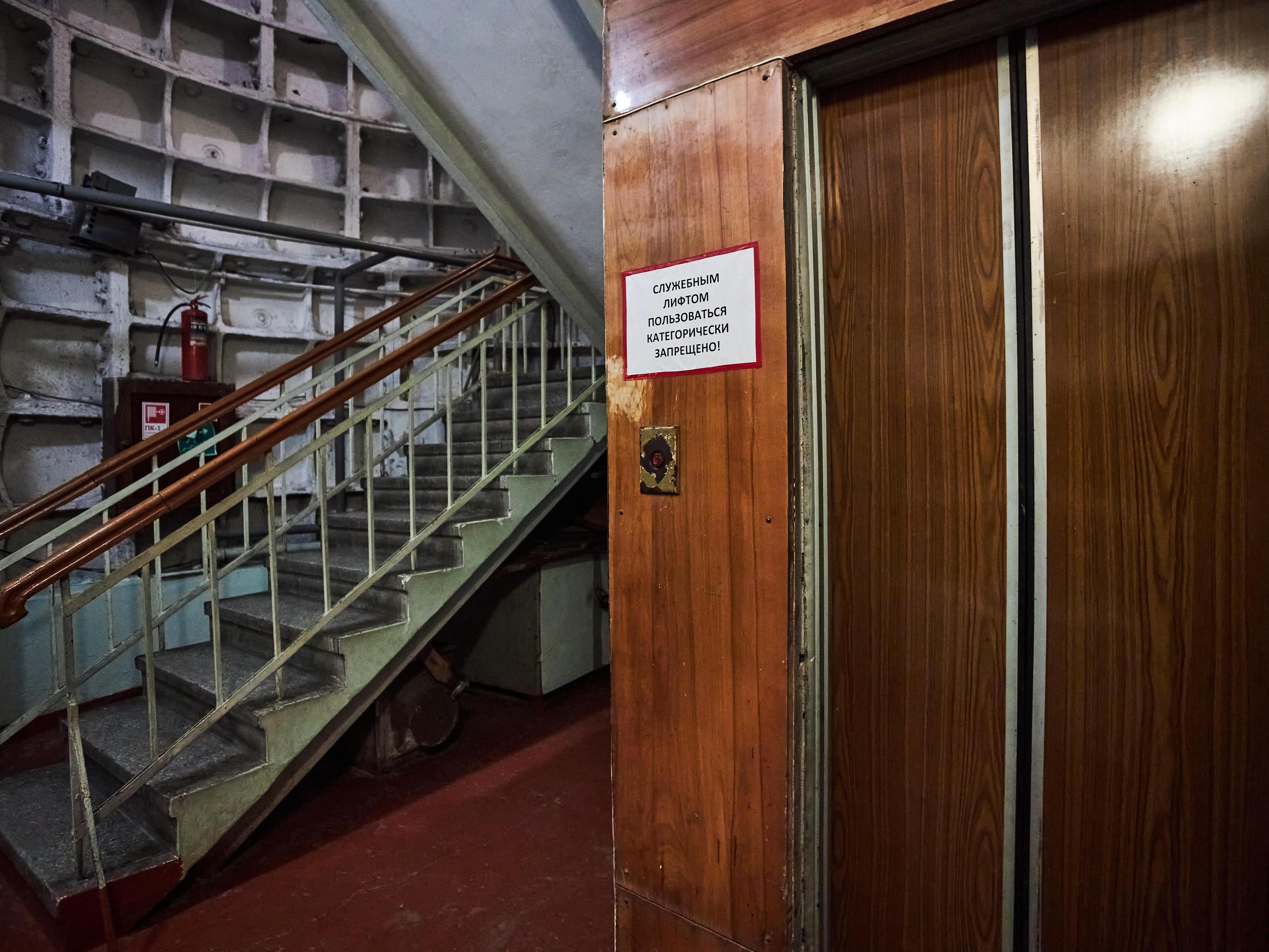 Descending the central shaft, you can see that some floors are operational. There are rooms for the Ministry of Emergency Situations (EMERCOM) and civil defense.