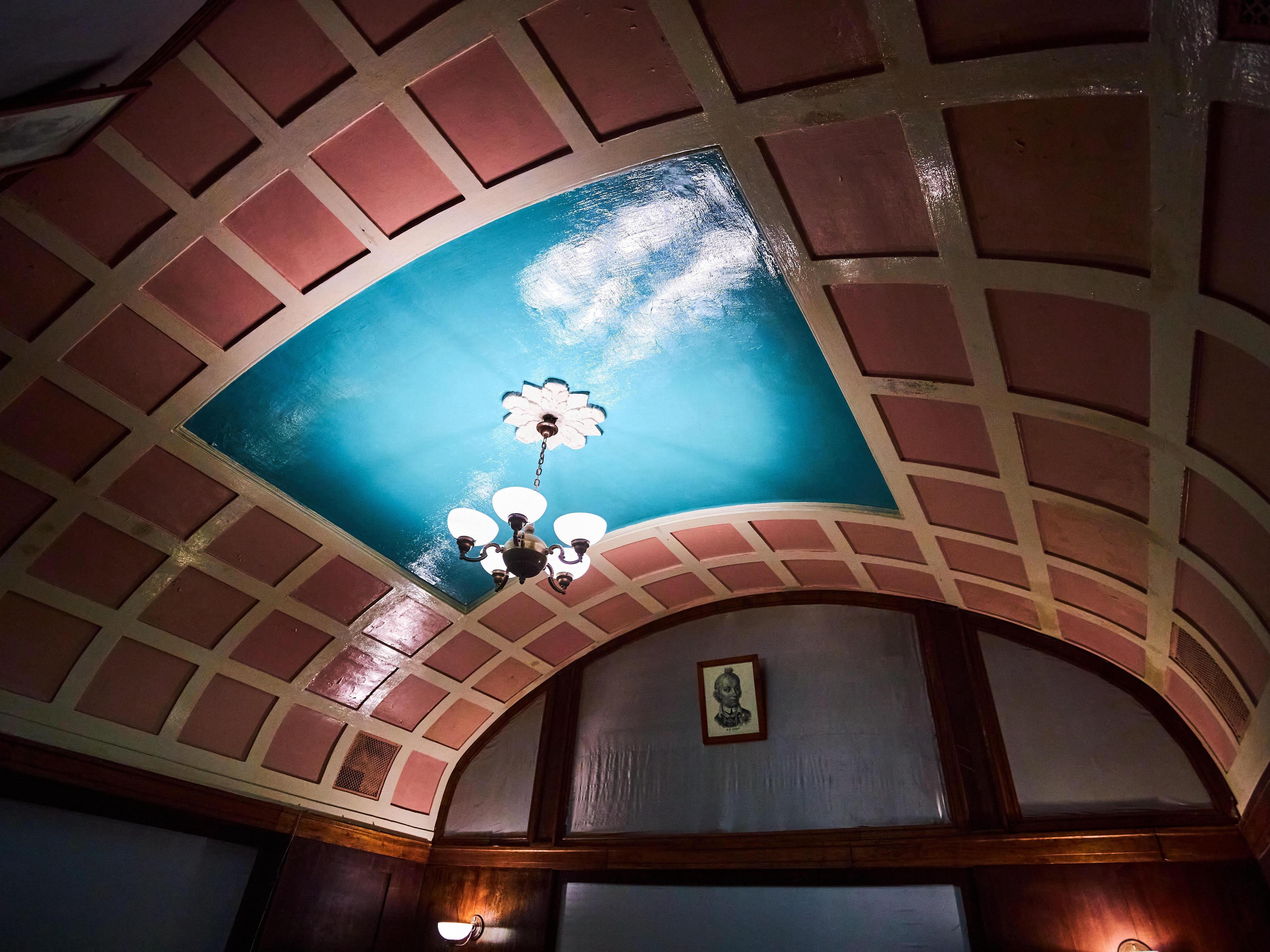 Stalin«s office is 32 square meters, the meeting hall is 70 square meters. The ceiling in the hall resembles the ceiling of the Moscow metro station »Aeroport.« The ceiling decor looks like parachute straps.