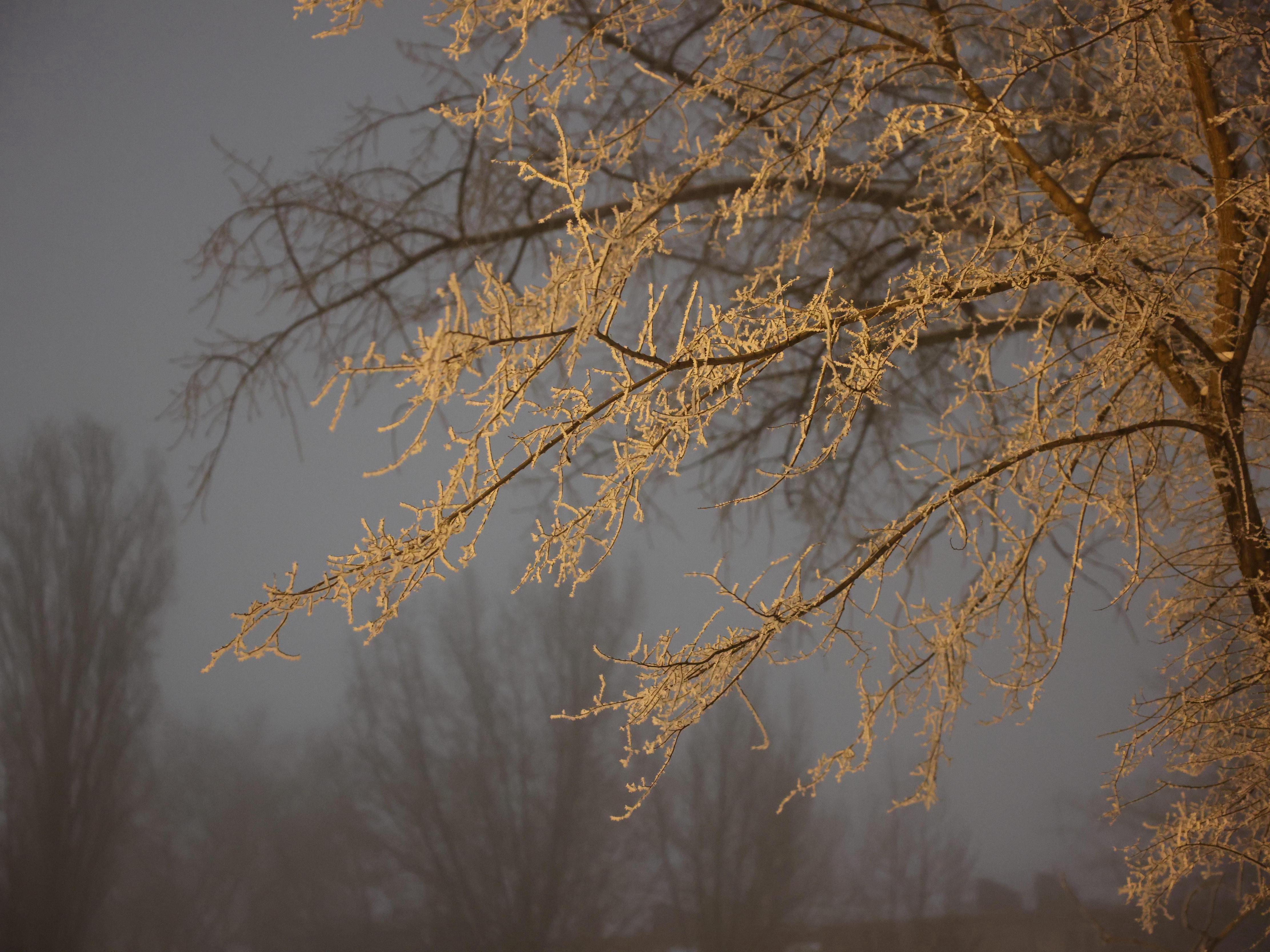 Tree branches are coated with frost due to moisture condensation from the dense, damp air.