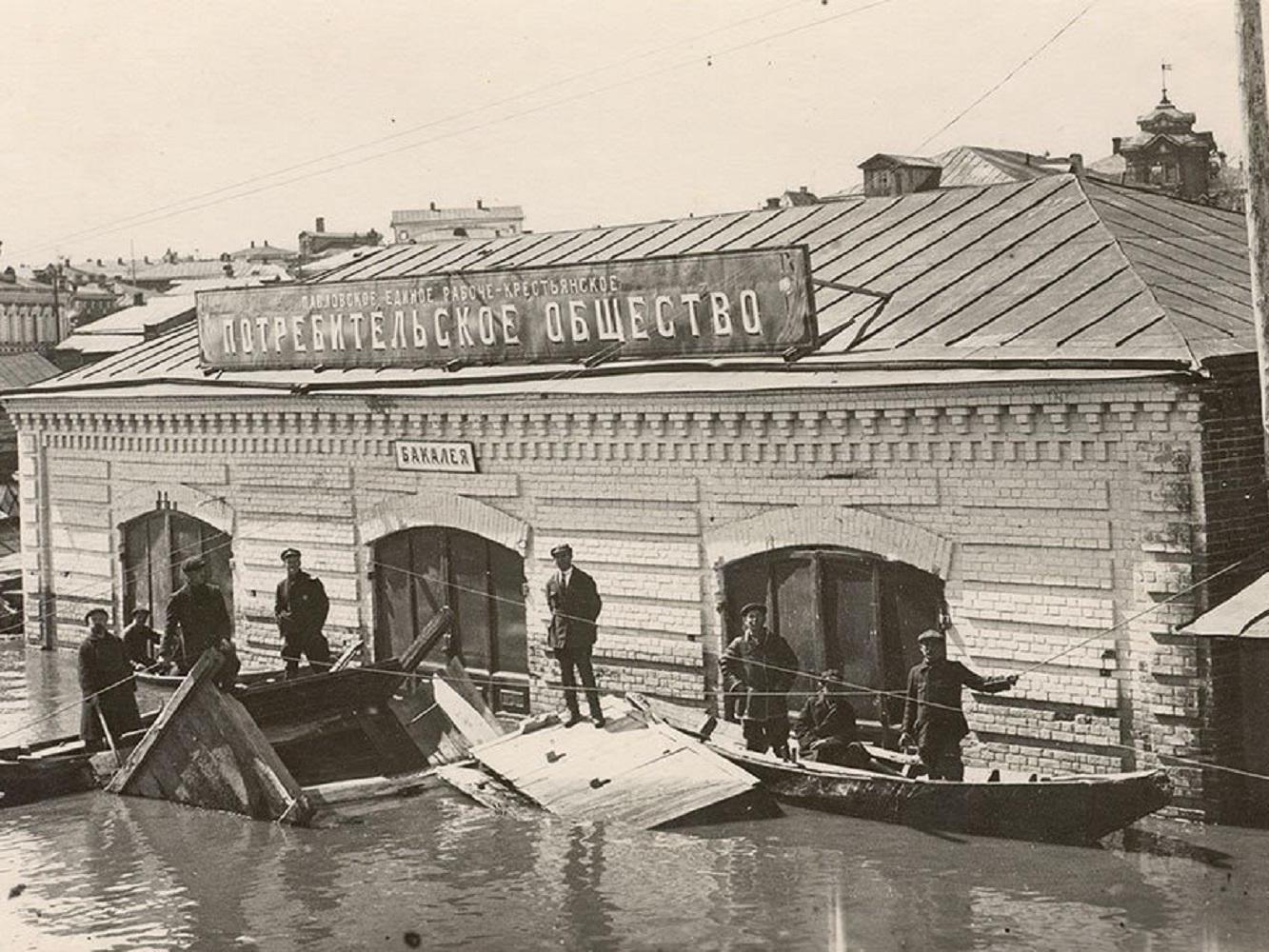Trade rows submerged in floodwaters in Pavlovo during the 1920s–1930s, highlighting seasonal challenges for commerce.