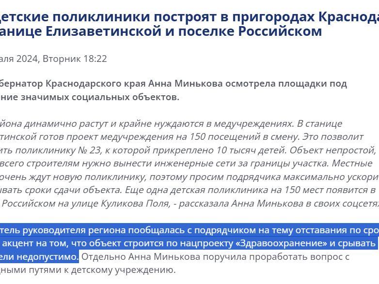 “The clinic in Yelizavetinskaya stanitsa was supposed to be completed in 2024. Now its readiness is 59%. I ordered to speed up and finish the work by the end of this year, and from March 2026 the clinic should receive children,” the governor firmly stated.