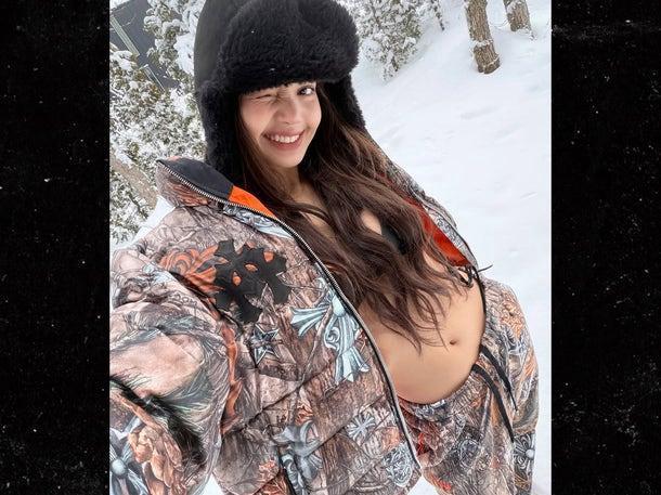 A daring bikini shot revealed under an unzipped jacket in a snowy winter setting.