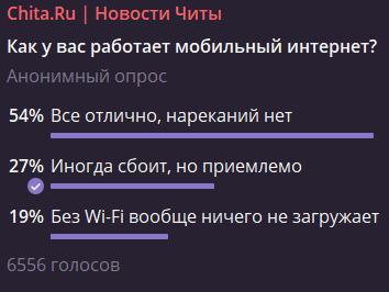 In a poll by the Chita.ru Telegram channel, 6,556 people participated, 54% of them responded that everything is working for them, another 27% considered the outages temporary, and 19% could not load anything without Wi-Fi.