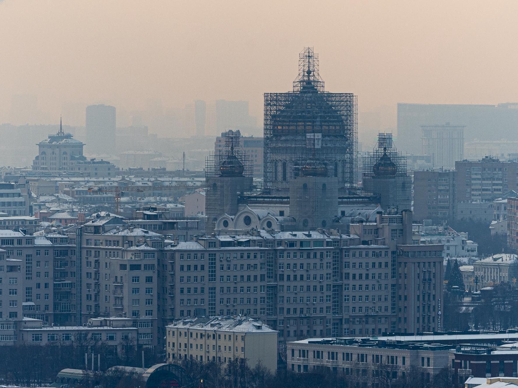 The domes of Christ the Savior Cathedral are wrapped in scaffolding.