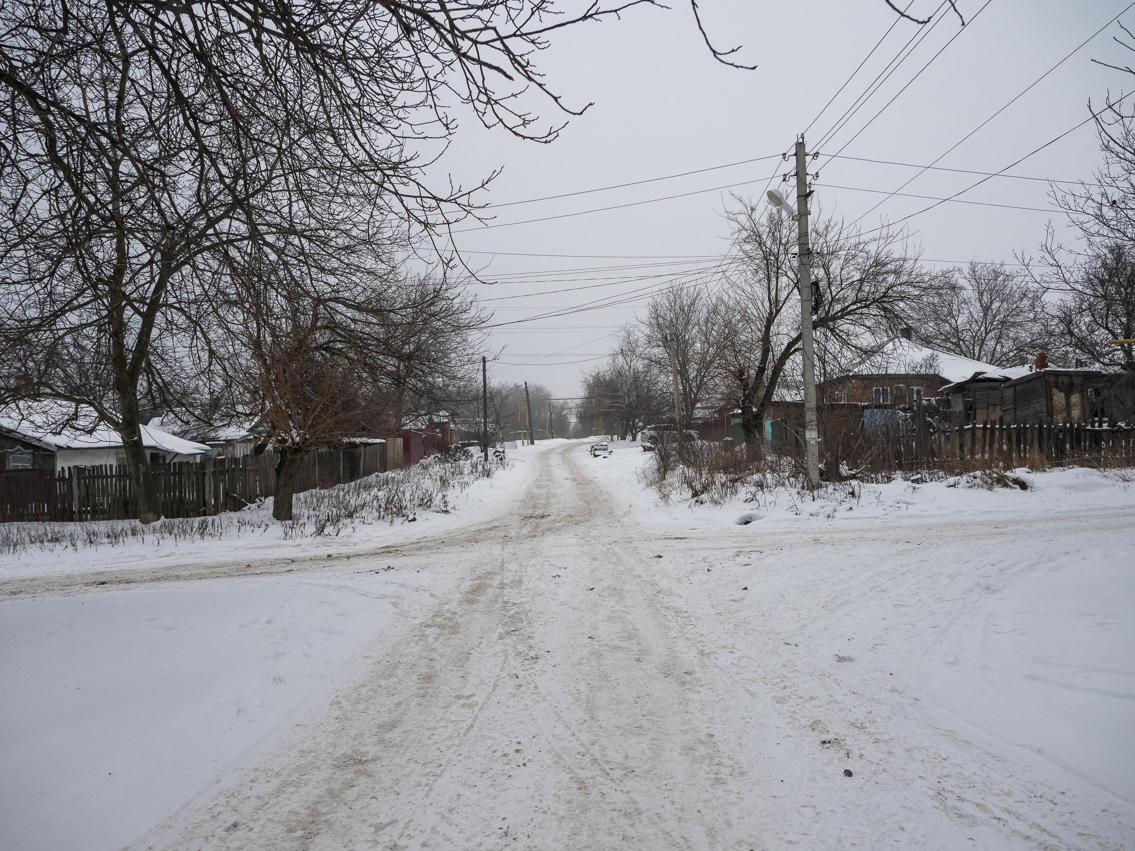 Dilapidated houses of the private sector give way to well-kept homes, near which neat flower beds are laid out. The yard is tended by local resident Svetlana. She is clearing snow but pauses to chat with us.