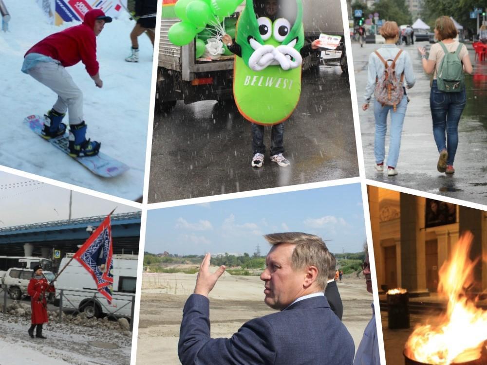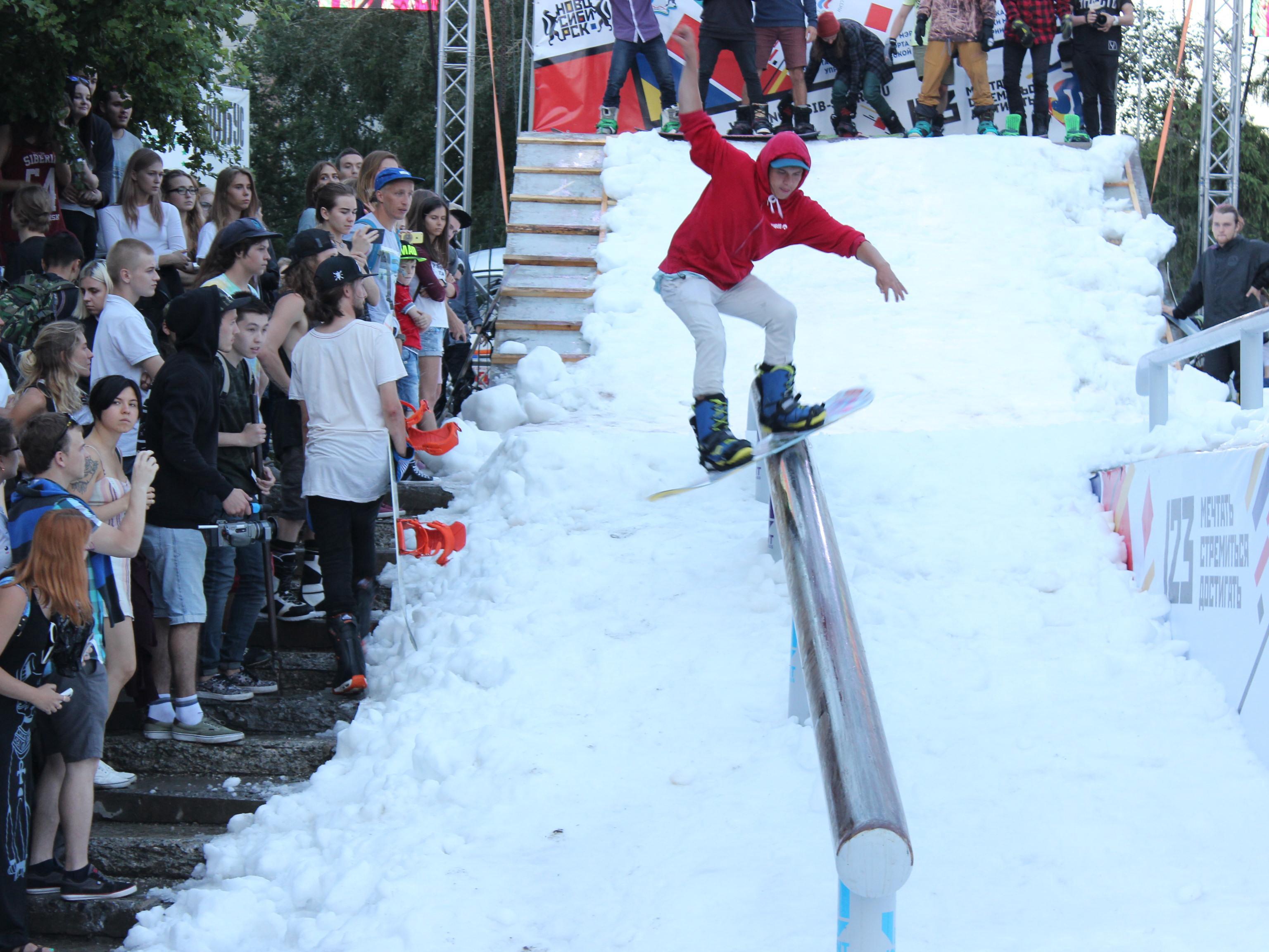 Novosibirsk residents, it seems, didn«t have enough snow mountains in winter, and during the City Day celebration at the end of June, a slope made of artificial snow was built near the Globus Theater, where snowboarders demonstrated their skills.