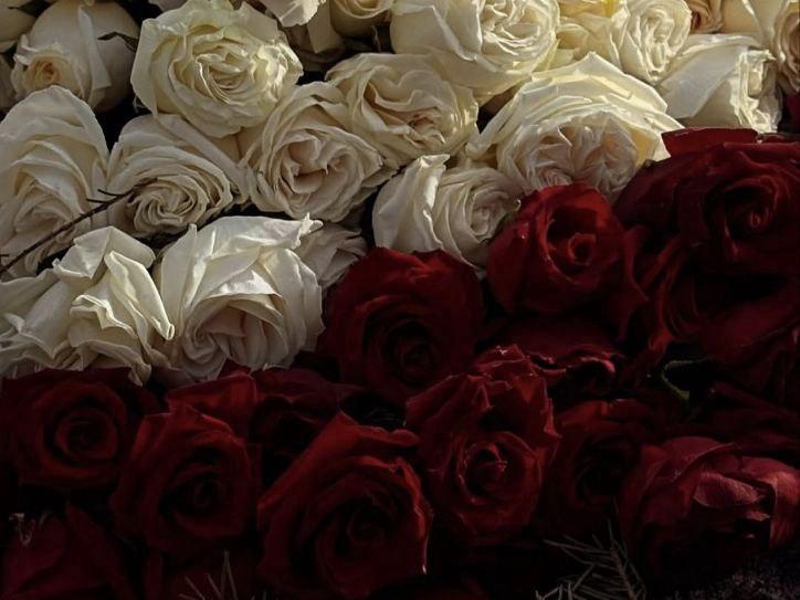 The grave was covered with many roses during the mourning ceremony, as shown in images.
