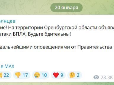 In Orenburg Oblast, a UAV attack danger has been declared once again. Governor Yevgeny Solntsev traditionally reported this at 05:14.