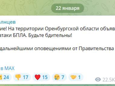 In Orenburg Oblast, a UAV attack danger has been declared once again. Governor Yevgeny Solntsev traditionally announced this at 07:36.