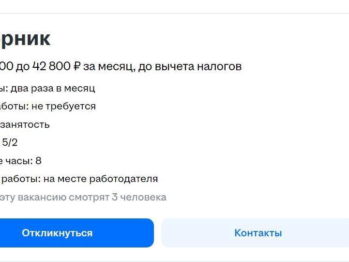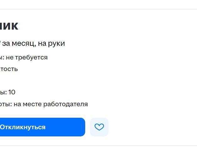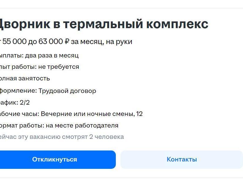 The thermal complex «Beach» offers a street sweeper from 55,000 to 63,000 rubles ($611-$700). In winter, he is required not only to remove snow but also to spread de-icing agents on roads. As «perks,» they promise free meals and free access to the thermal baths.