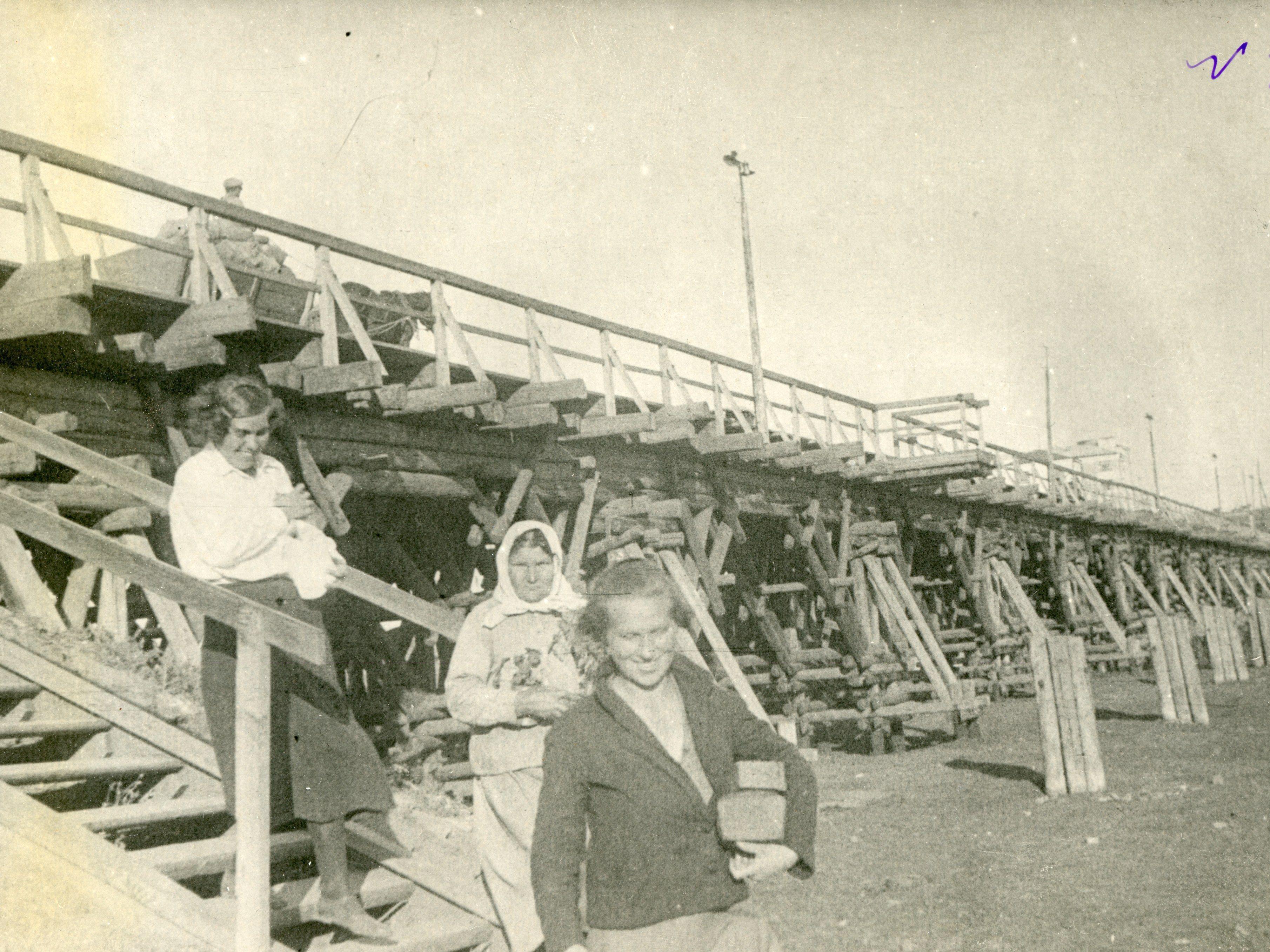 A wooden bridge crosses the Miass River near the ChEMK (Chelyabinsk Electrometallurgical Plant) in 1936.