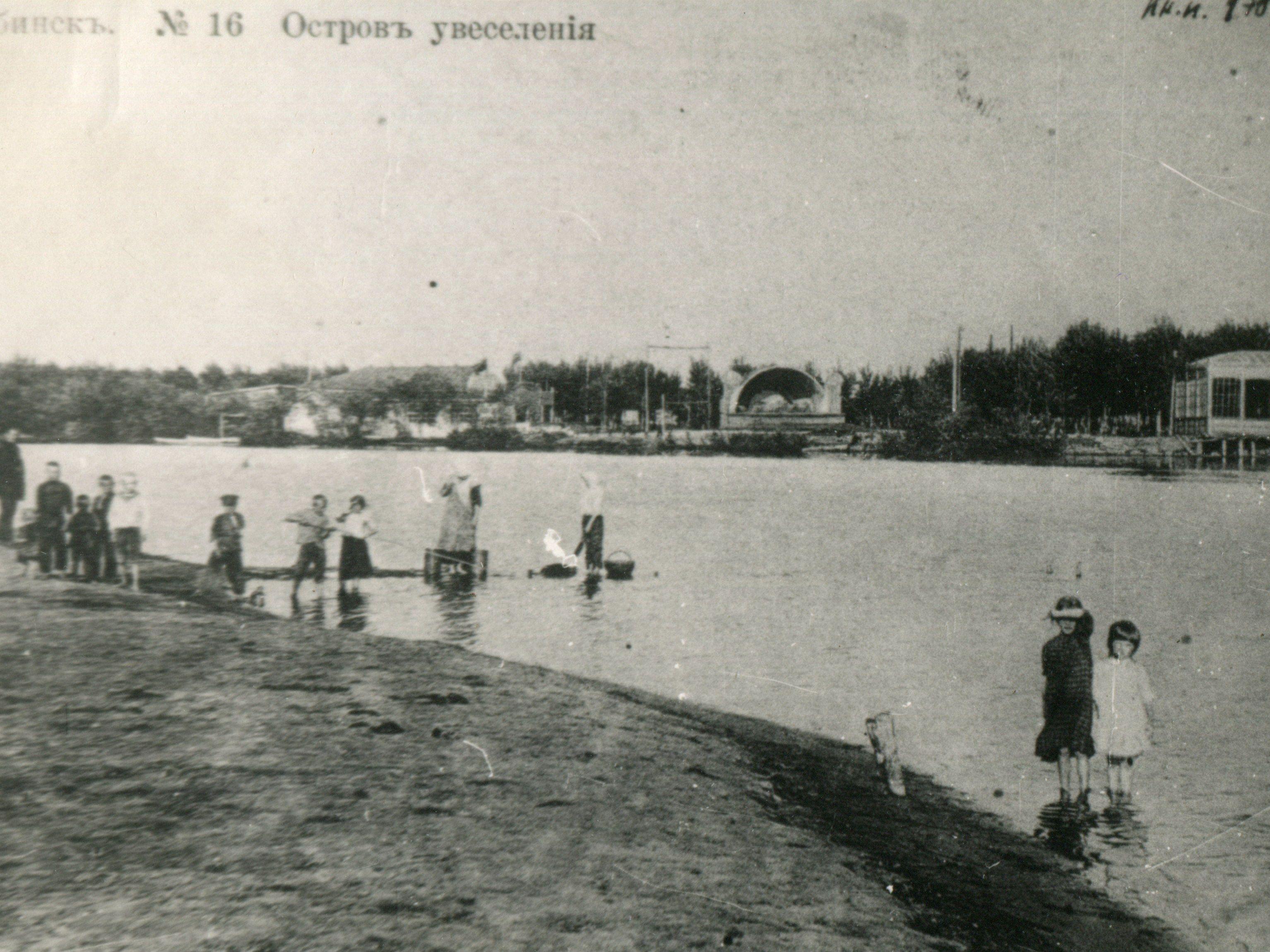 An entertainment island on the Miass River appears in a numbered postcard from Chelyabinsk, published by photographer V.G. Polovnikov between 1909 and 1917.