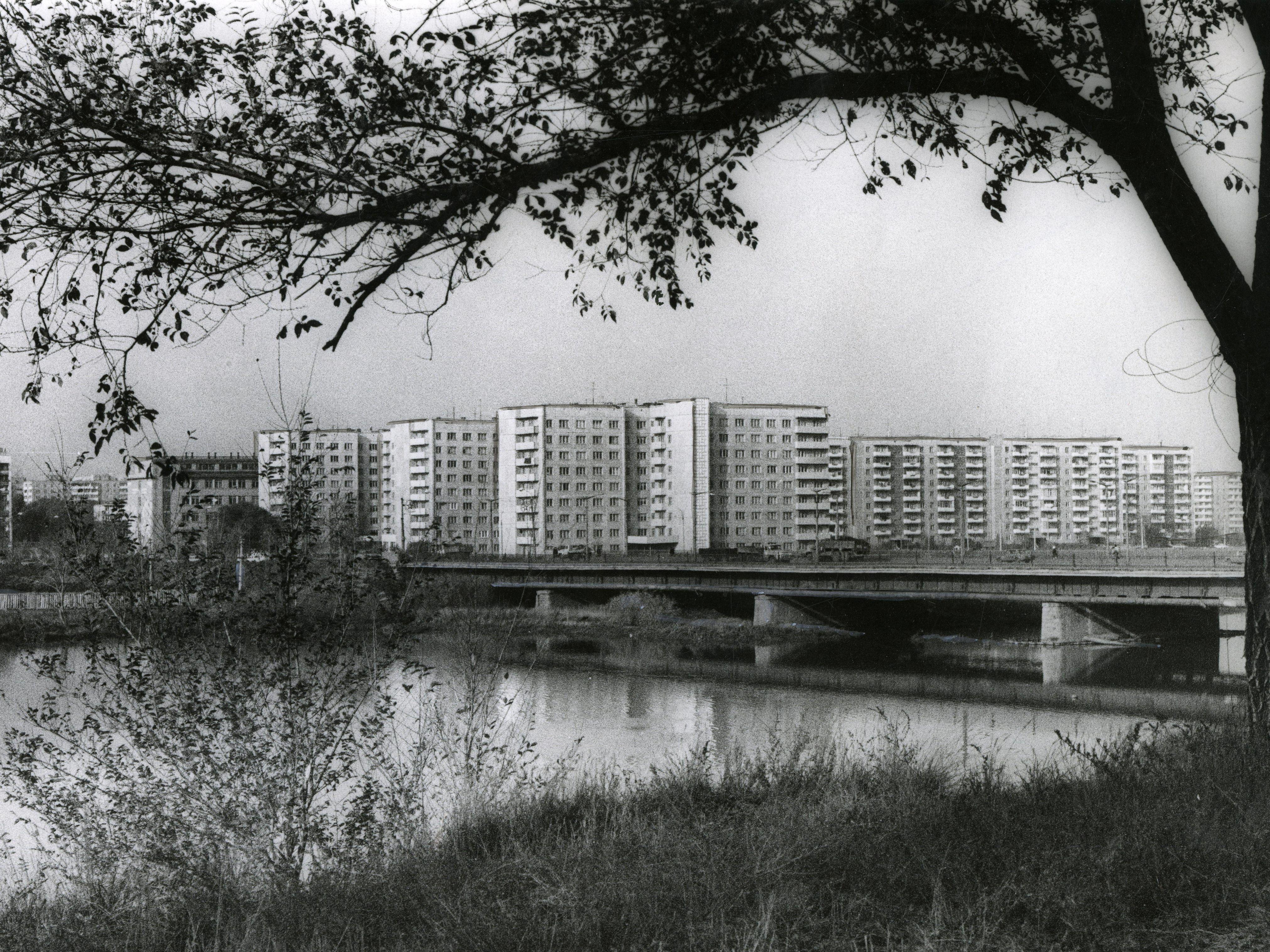 A reinforced concrete bridge spans the Miass River on Pobedy Prospekt in 1990, later renamed Leningradsky Bridge.
