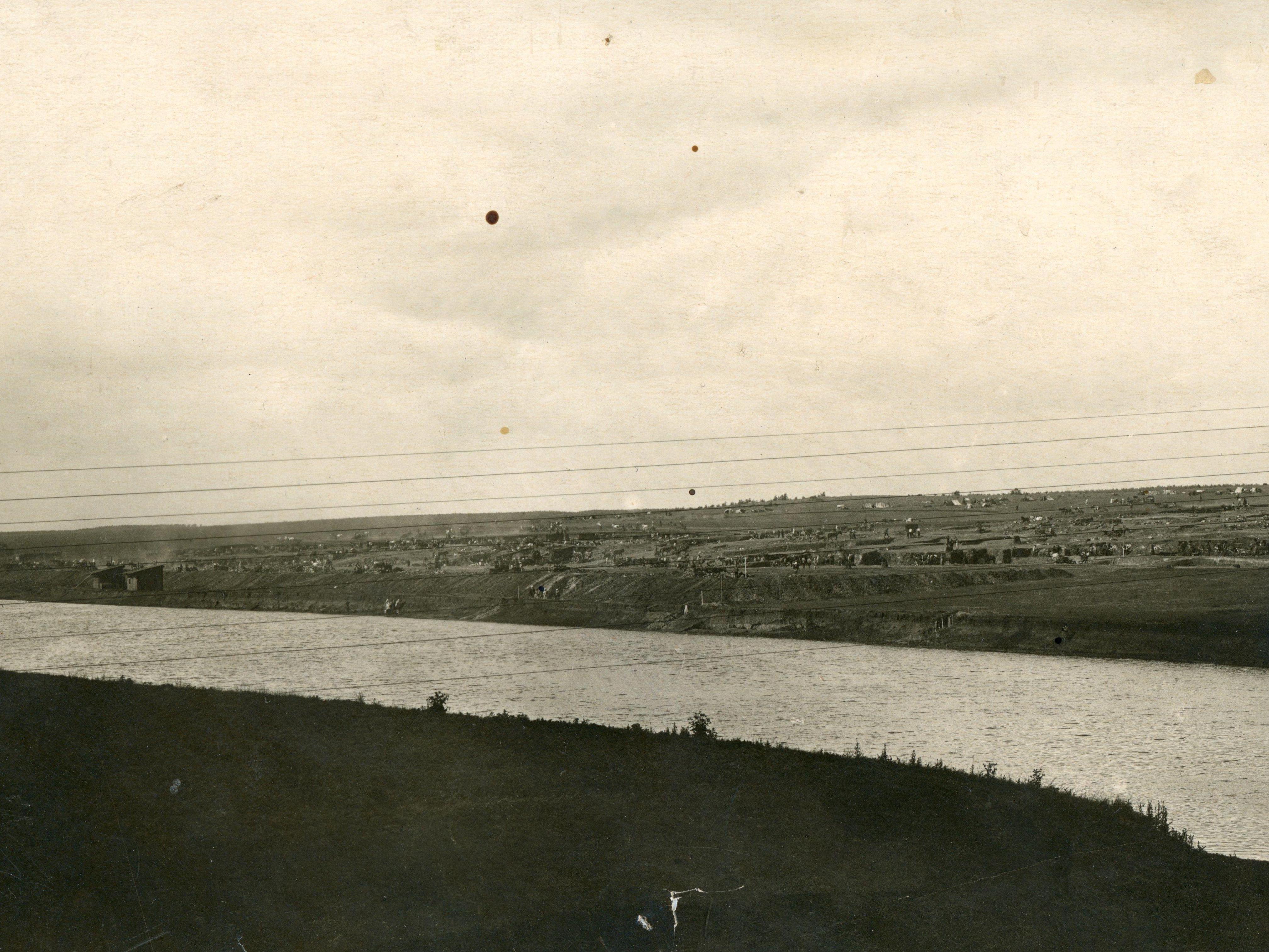 A panorama shows the construction of the ChGRES (Chelyabinsk State District Power Station) residential microdistrict on the Miass River bank in the early 1930s.