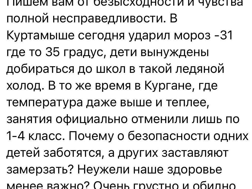 «In Kurtamysh, the frost hit -31 degrees Celsius (-24°F), somewhere -35°C (-31°F), and children are forced to travel to schools in such icy cold,» according to the appeal to the head of the Internet League.