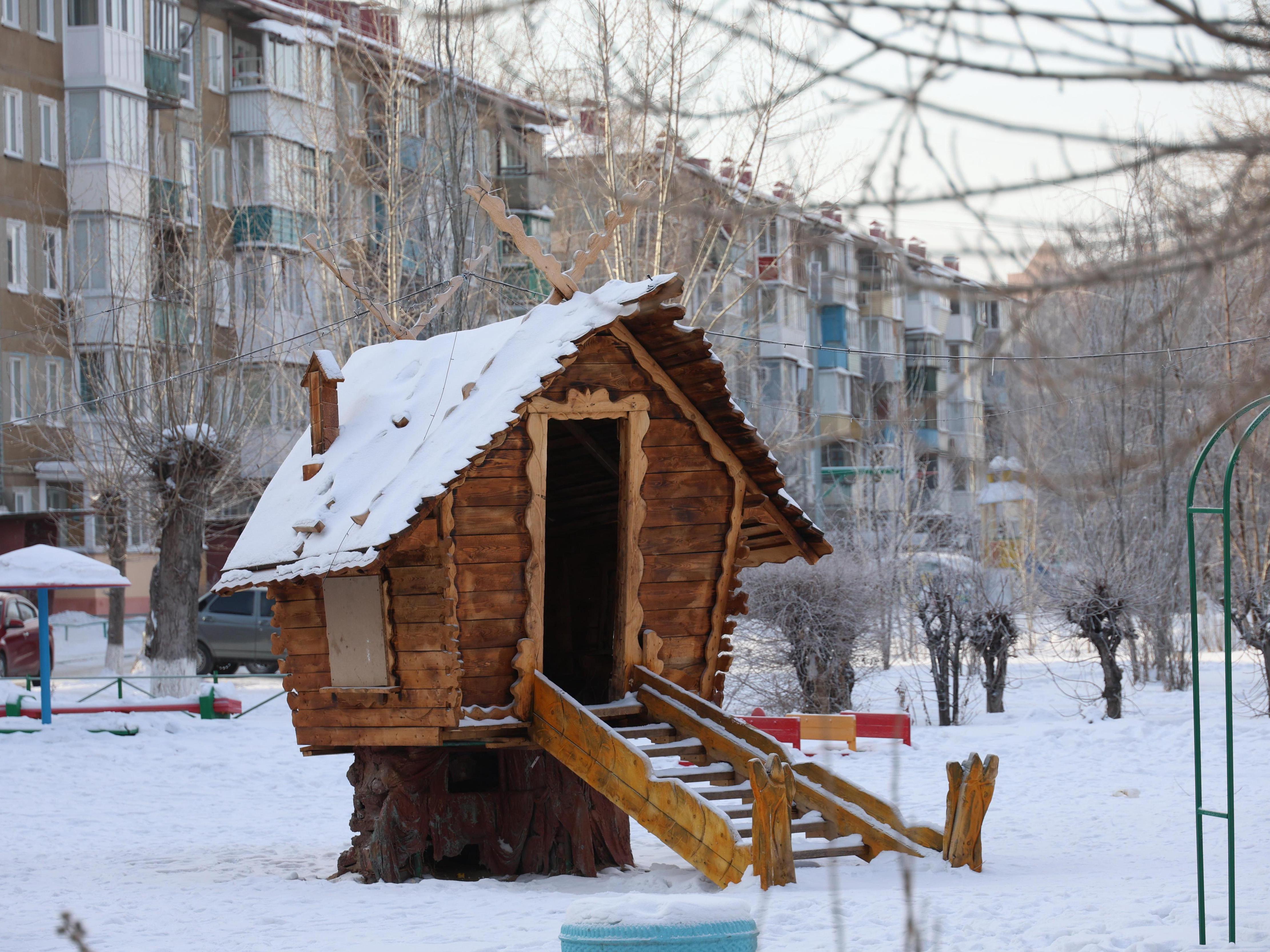 A fairy-tale hut on chicken legs is perched on a stump in a courtyard.