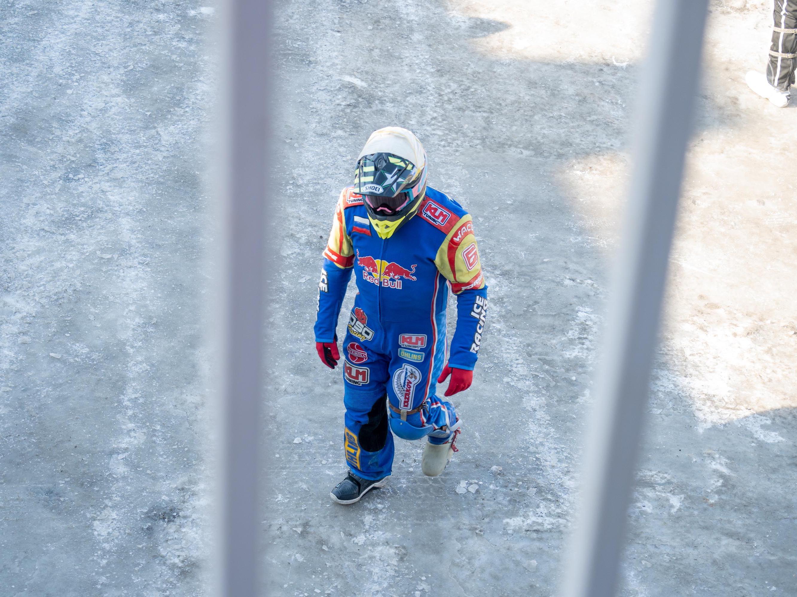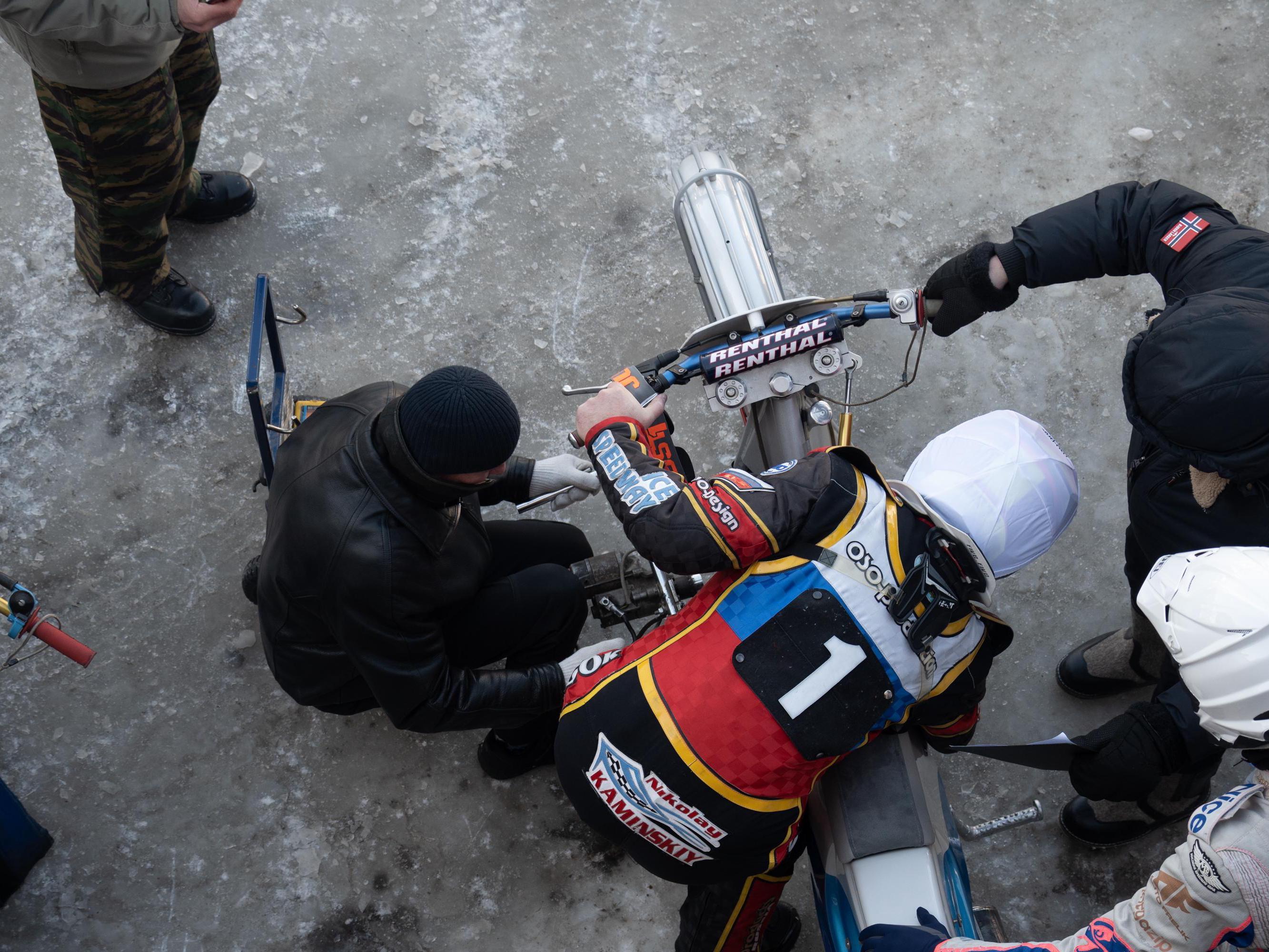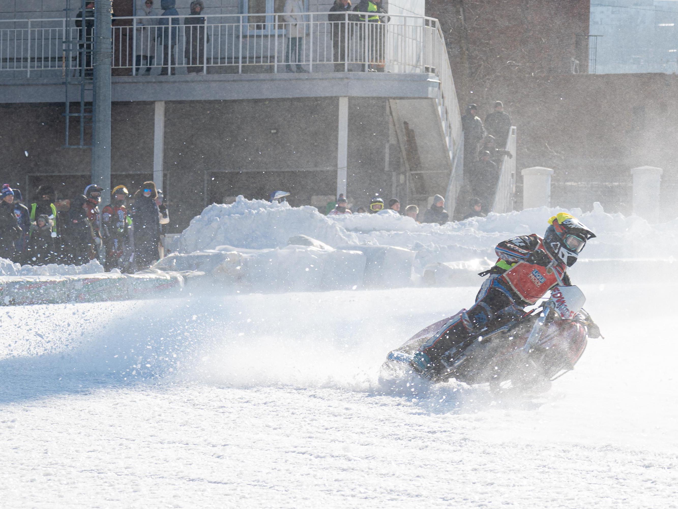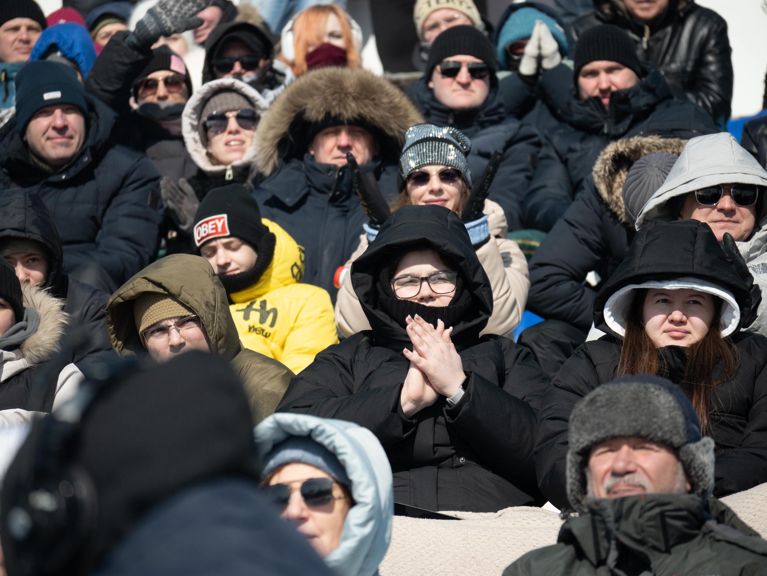 The huge spikes on the motorcycle tires turned the stadium ice into fine ice chips, blocking the view for everyone behind the winner. Watching this was both interesting and scary. And there was no shortage of spectators — with the start of the race, the stands quickly filled up, people brought tea and blankets to keep warm. The weather did not show mercy this time either, with the air temperature holding at minus fifteen degrees Celsius (5°F).