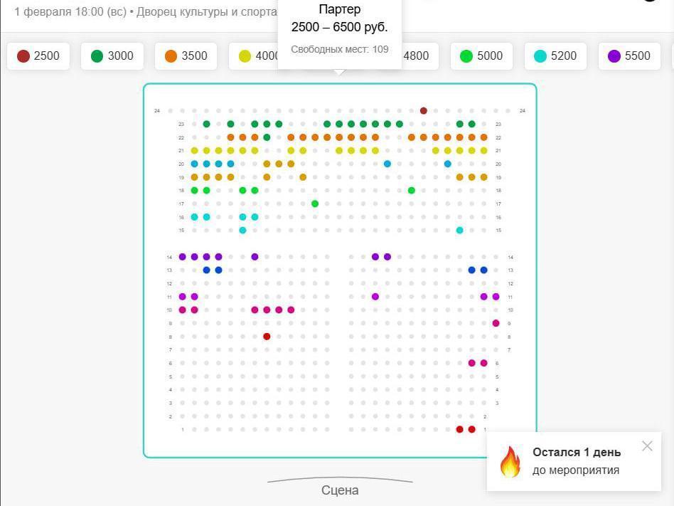 Ticket sales for Dolina«s Domodedovo concert showed limited seating availability with over 100 seats still open.