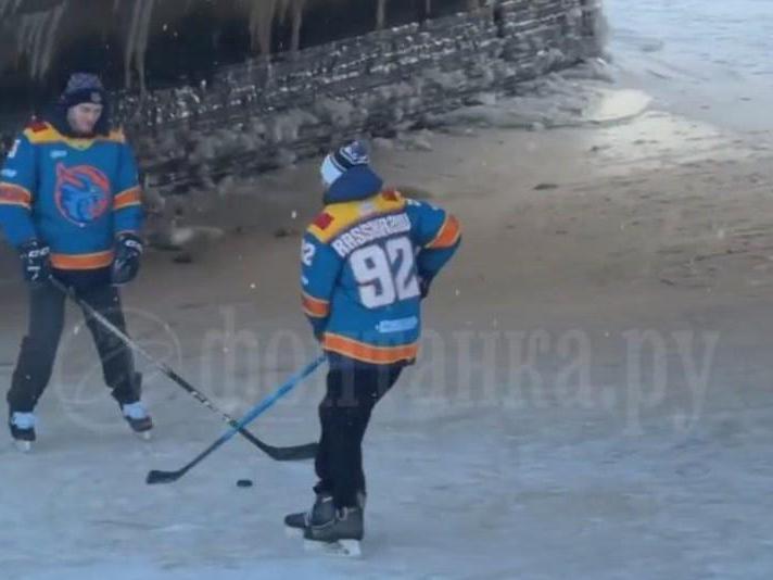 On the ice of the Fontanka, under the Lomonosov Bridge, defenseman Vladislav Leontyev (No. 3) and forward Kirill Rasskazov (No. 92) of the Shanghai Dragons club demonstrated high skill in stick handling.