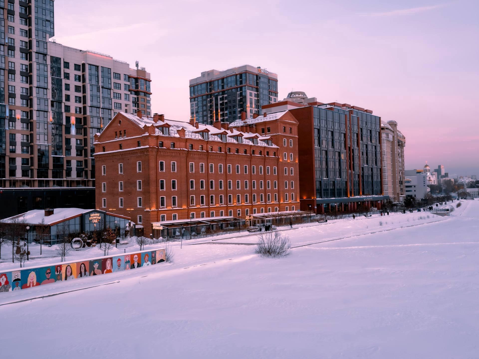 Lilac tones highlight the architecture of a Yekaterinburg building.