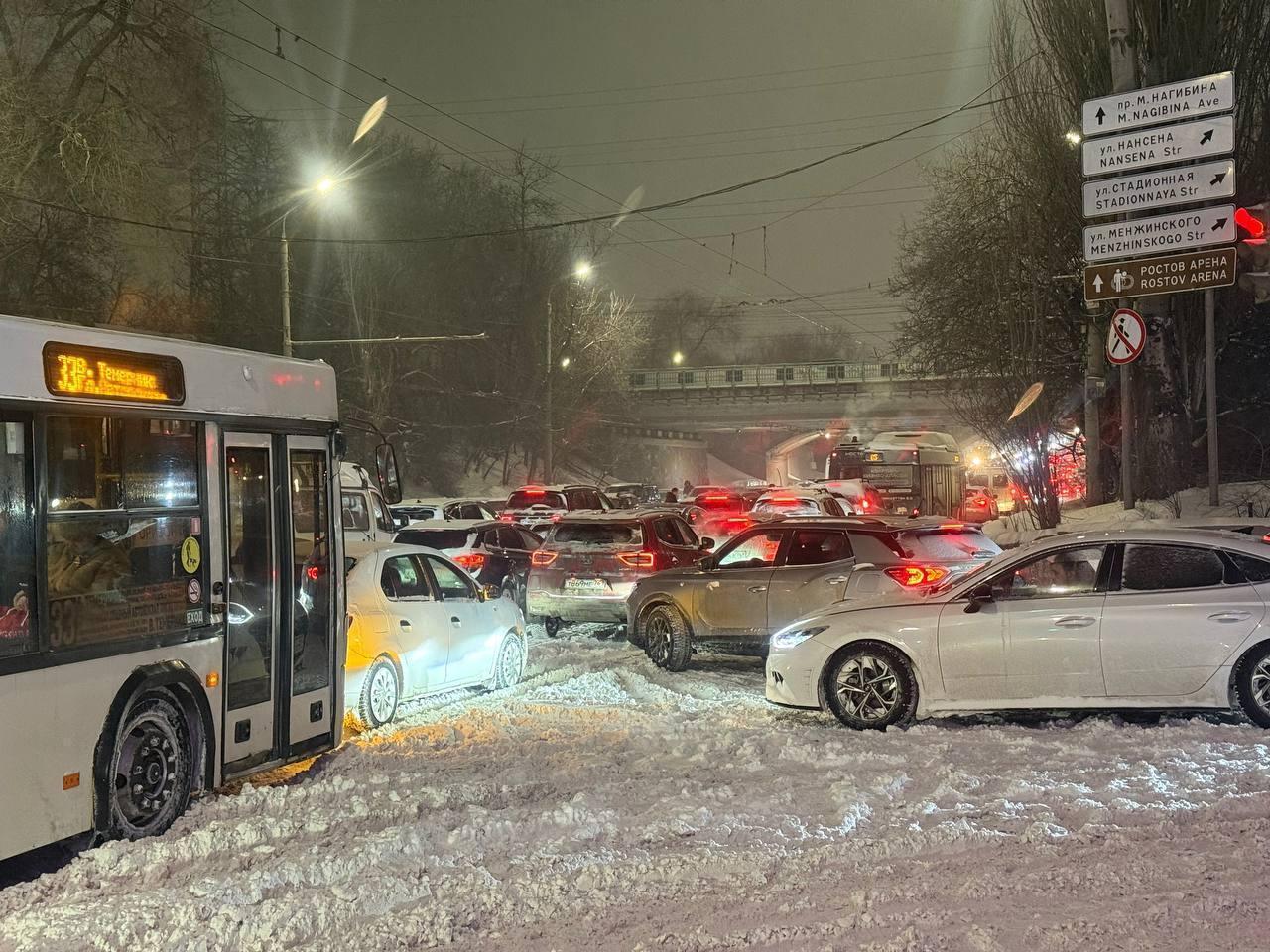 Buses stuck on the hill of Nagibin Prospekt near DGTU created a major obstruction.