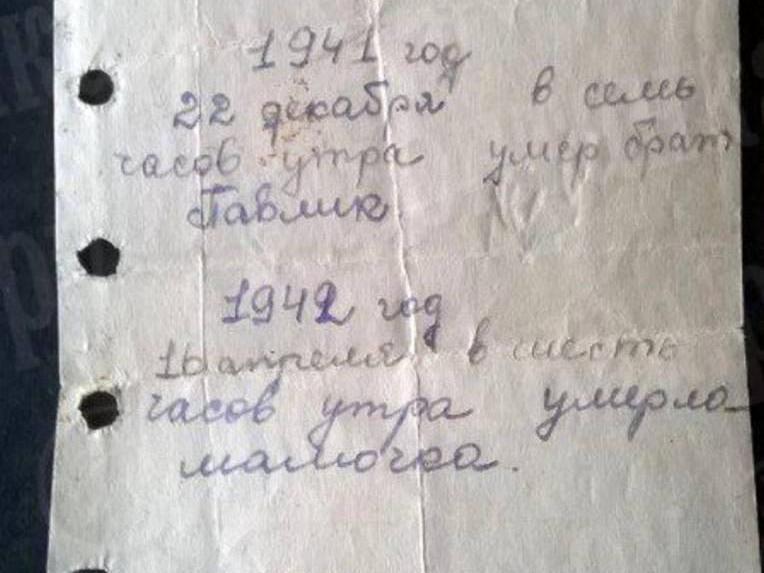 In the preserved note, the girl’s handwriting reads: «December 12, 1941. At eight in the morning, my beloved daddy died. December 22, 1941. At seven in the morning, my brother Pavlik died. April 16, 1942. At six in the morning, my mommy died.»