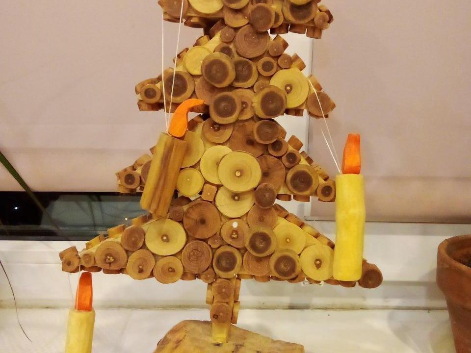 Second place was taken by a spruce assembled from round wood cuts and decorated with decorative candles. Its author, Nikolai, said that the structure is made from eight types of wood and has been accompanying him to various offices for over five years.