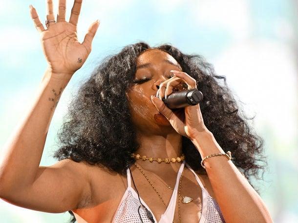 Images capture SZA during live performances on stage.