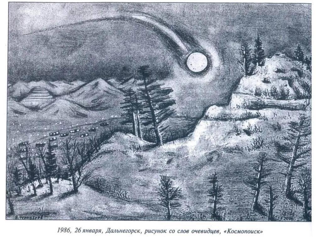 «The ball flew low, and it seemed it would knock down part of the smokestack of the »Dalpolymetal« processing plant. It was round, without any protrusions or depressions. It seemed made of metal and in color resembled slightly heated stainless steel. I thought it was some kind of military projectile. I didn»t hear any sounds. I saw it fall at the height, but also didn«t hear the sounds of the crash. The ground caught fire at that spot.»