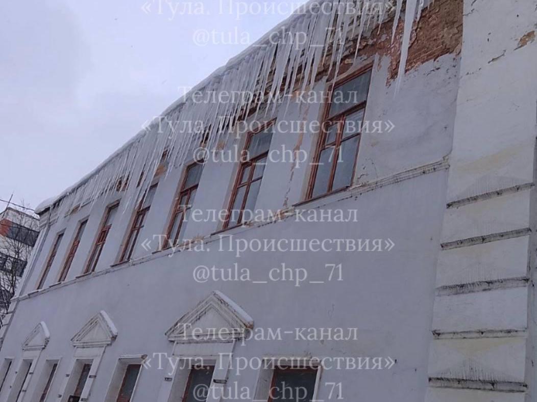 Problems with icicles, or rather with the fact that no one removes them, are occurring all over Tula, not only in the Proletarsky District. For example, this is what the roof of a building on Kaminsky Street looks like, near a tram stop.