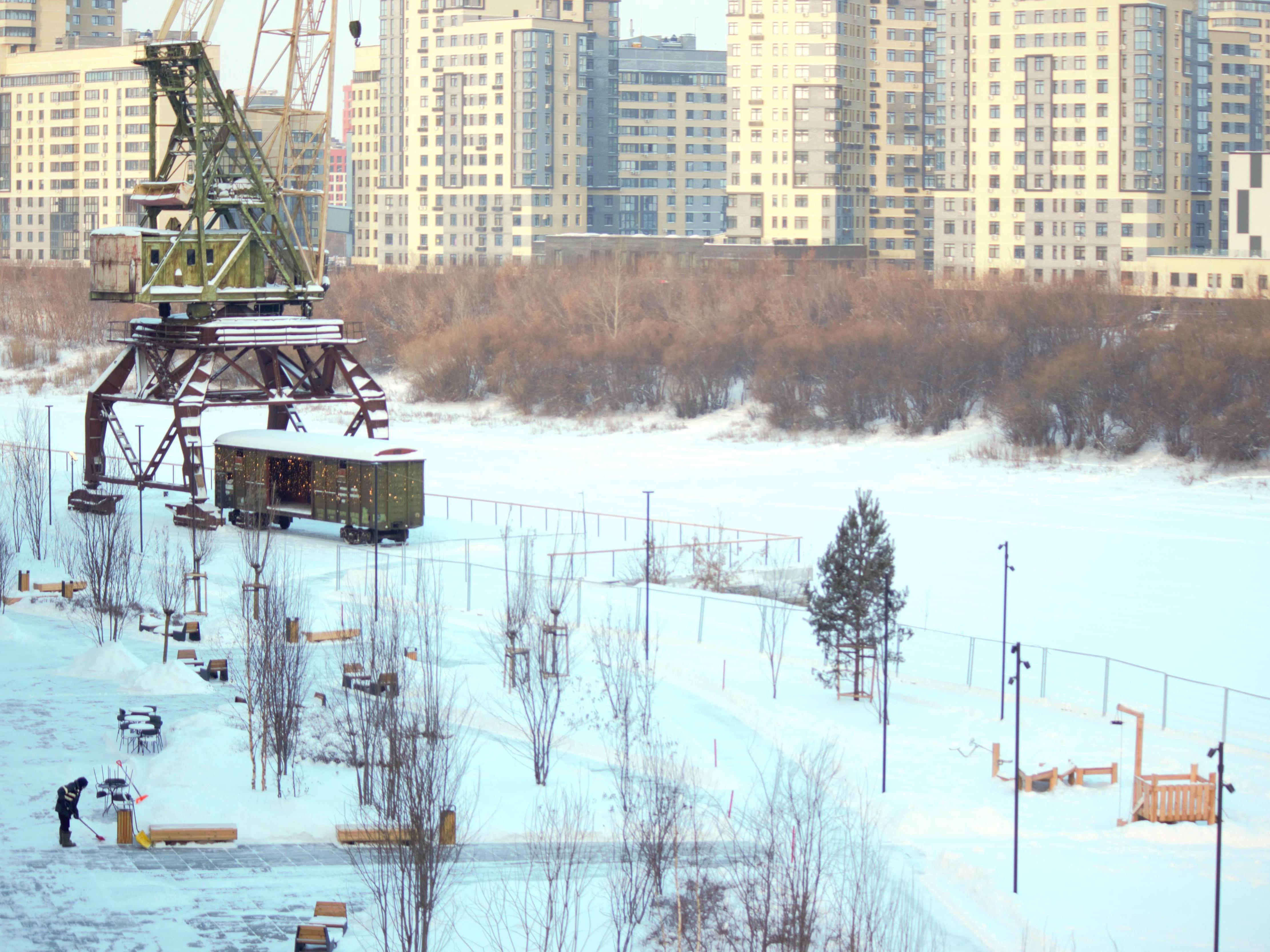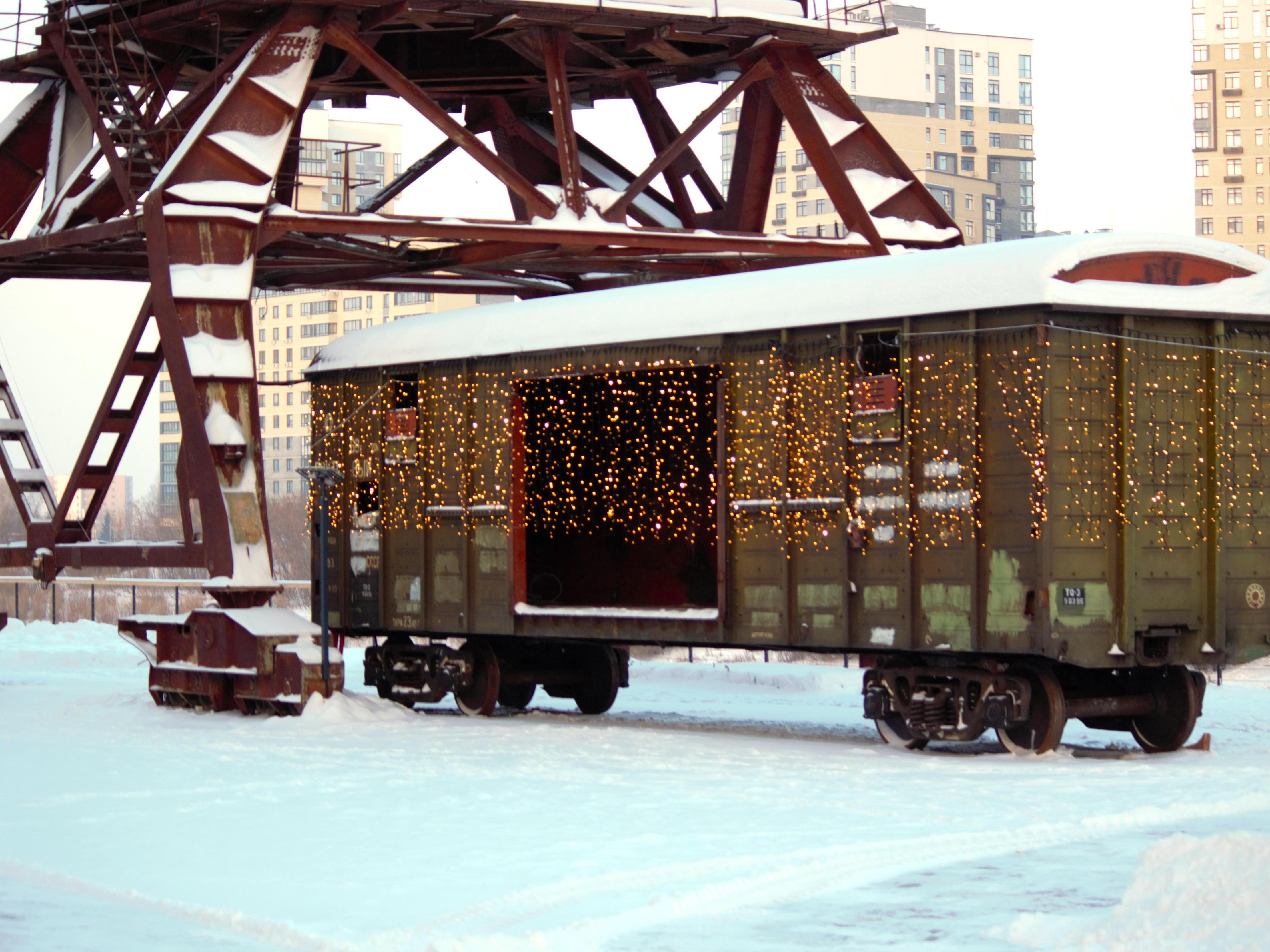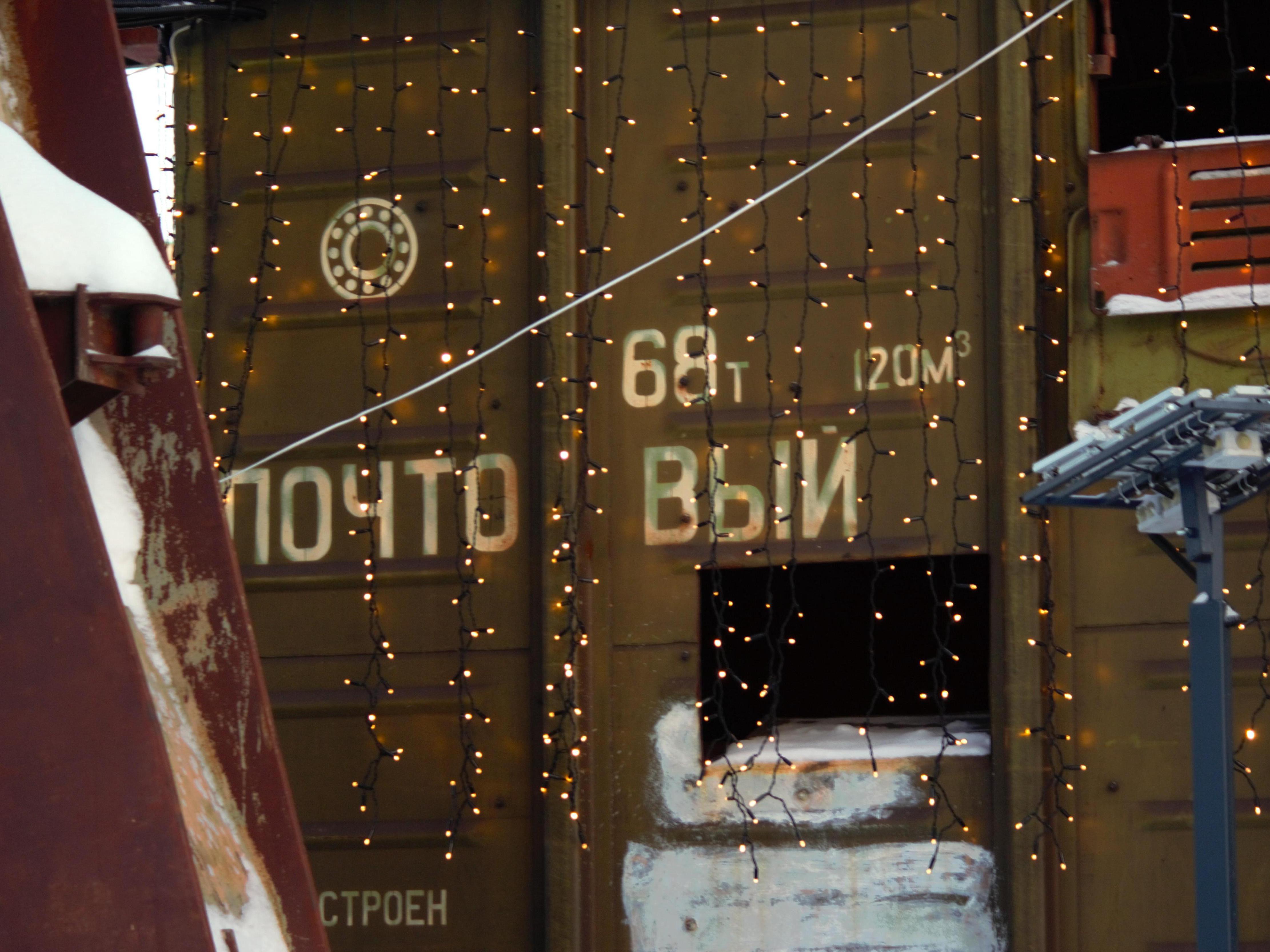 If you walk a bit further, small neat fences will appear, and the main feature currently on this embankment — the «Albrecht» port crane. Next to it, a mail car has been placed, decorated festively.