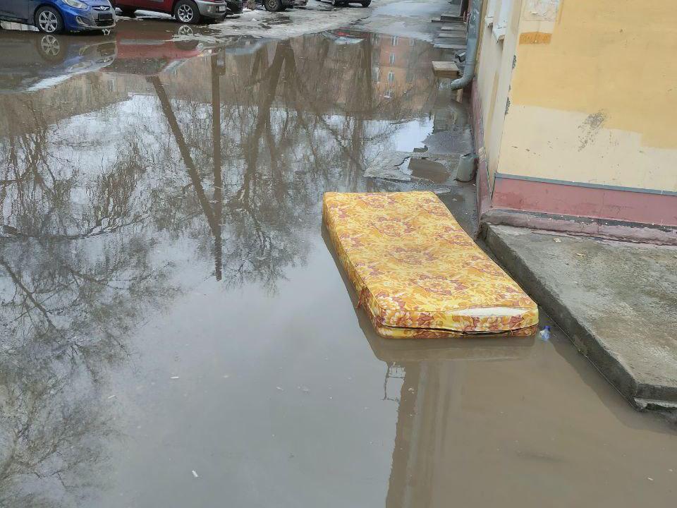 Residents of house No. 32 on Dzerzhinsky Street are once again asking utility services to solve the longstanding problem of their courtyard. Every even moderately heavy rain turns the yard into an impassable swamp — water accumulates near the walls of the house, and to exit the entrance, one has to use rubber boots or perform acrobatic feats.