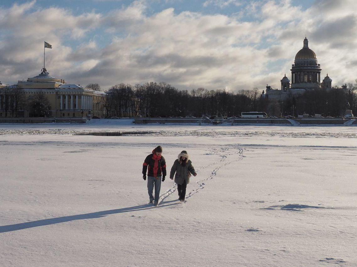 The weather in St. Petersburg softened after the frosty weekend, but this did not stop the brave souls who continue to stroll on the frozen surface of rivers and canals. On Tuesday, February 3, the sun joined them, creating a picturesque scene.