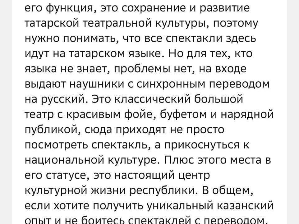 «A very beautiful, new theatre. An interesting show. An immersion into Tatar culture and language», wrote Alexander on 15 September.