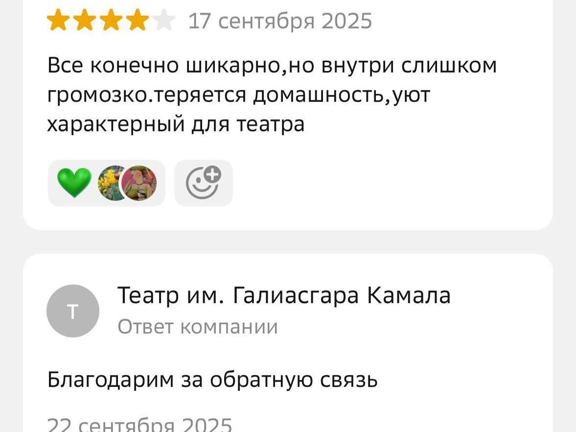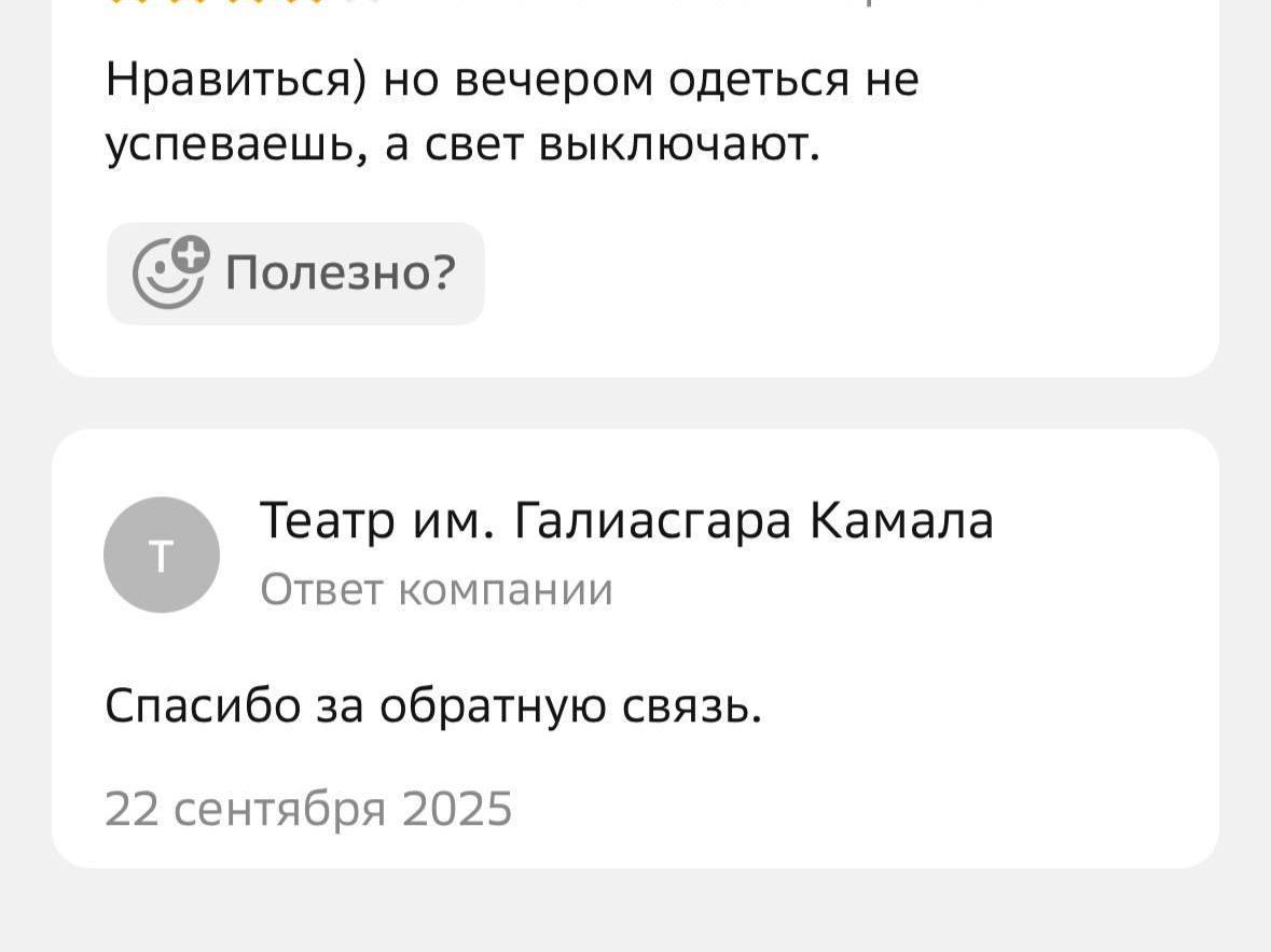 The Kamal Theatre’s press service told us they personally respond to every comment. So we look at the replies. The theatre apologizes to dissatisfied audience members and explains why various inconveniences occurred.