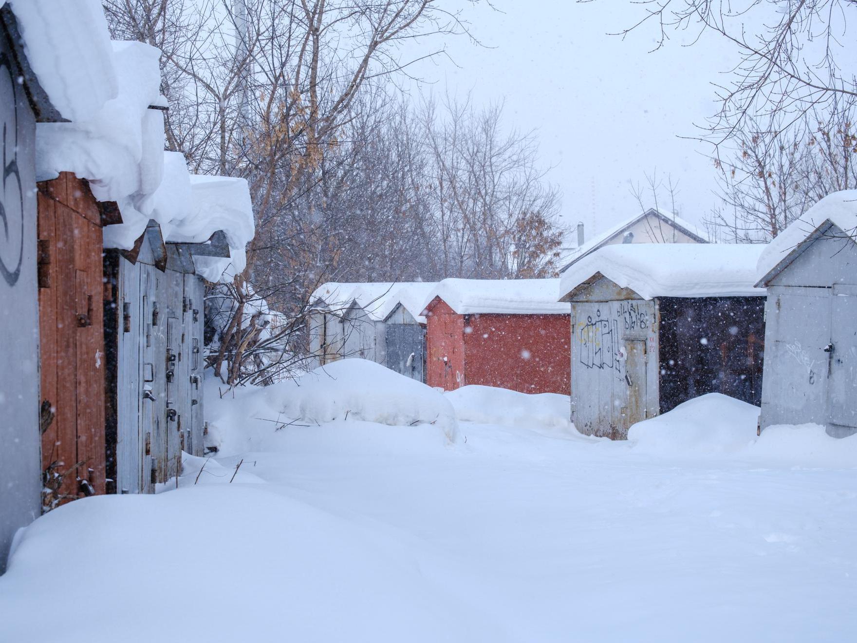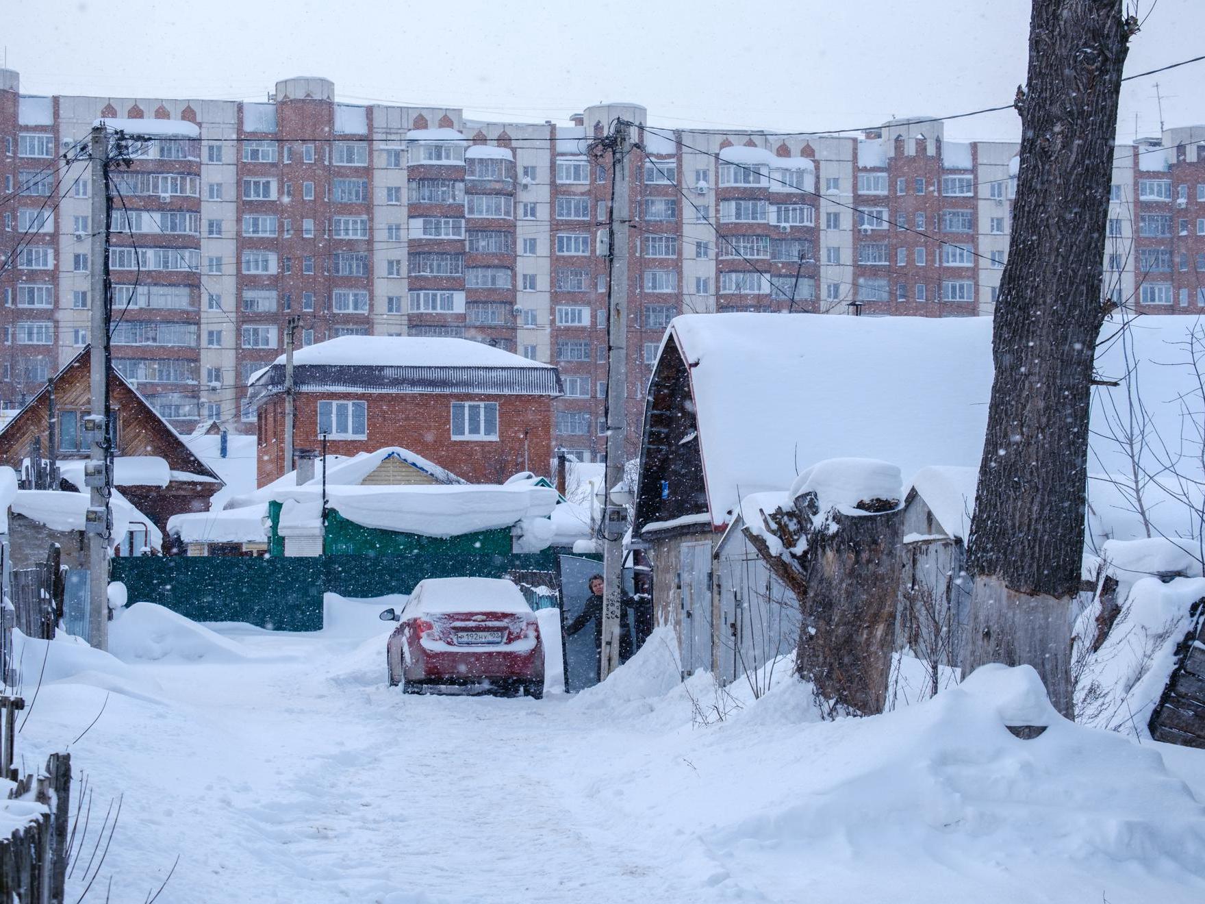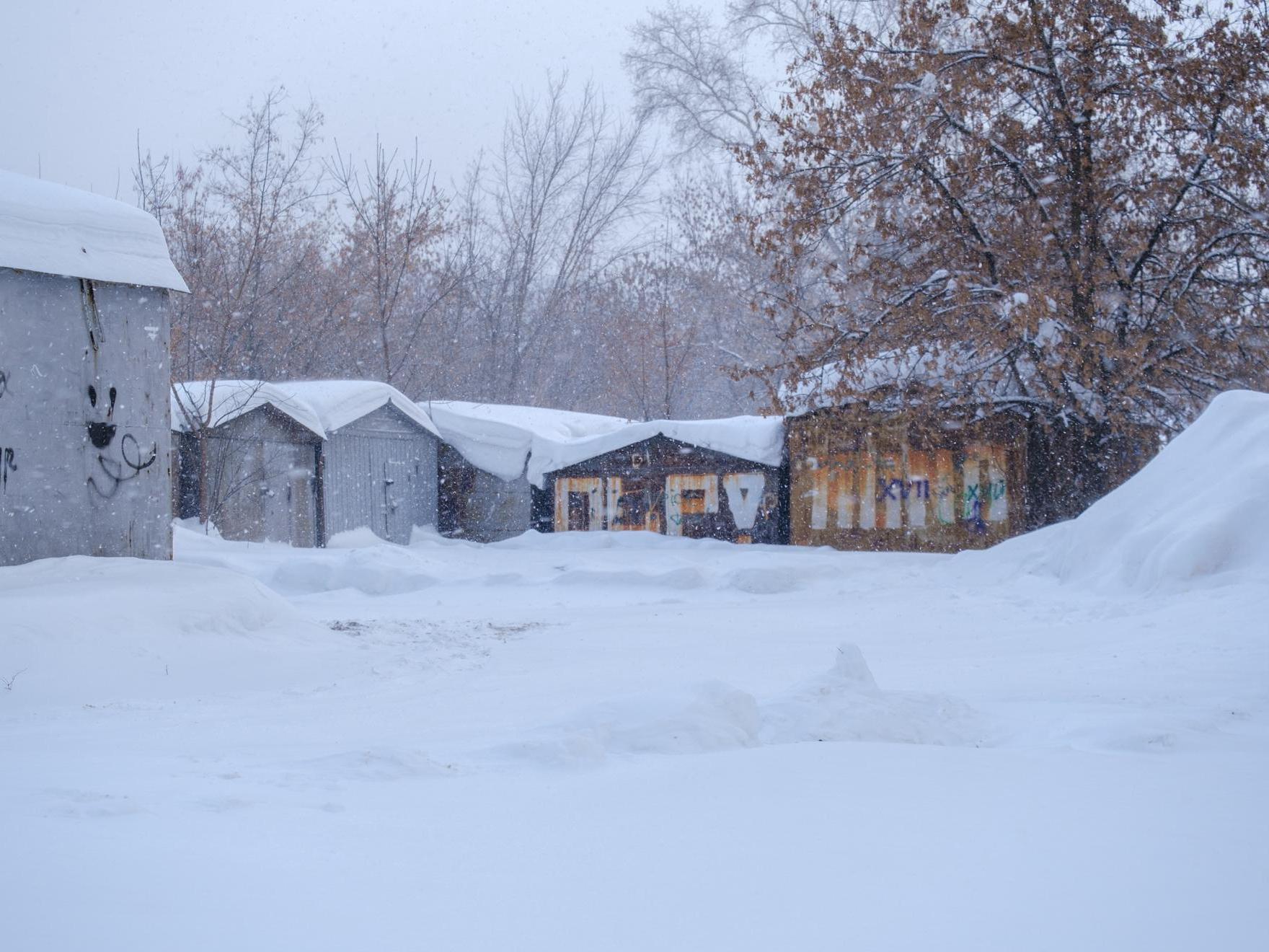 At the exit from the garages, we see a gloomy high-rise, near which stands a snow-covered «pyatnashka» — a VAZ-2115. Apparently, the owner couldn«t drive out and decided to leave the »swallow« to winter.