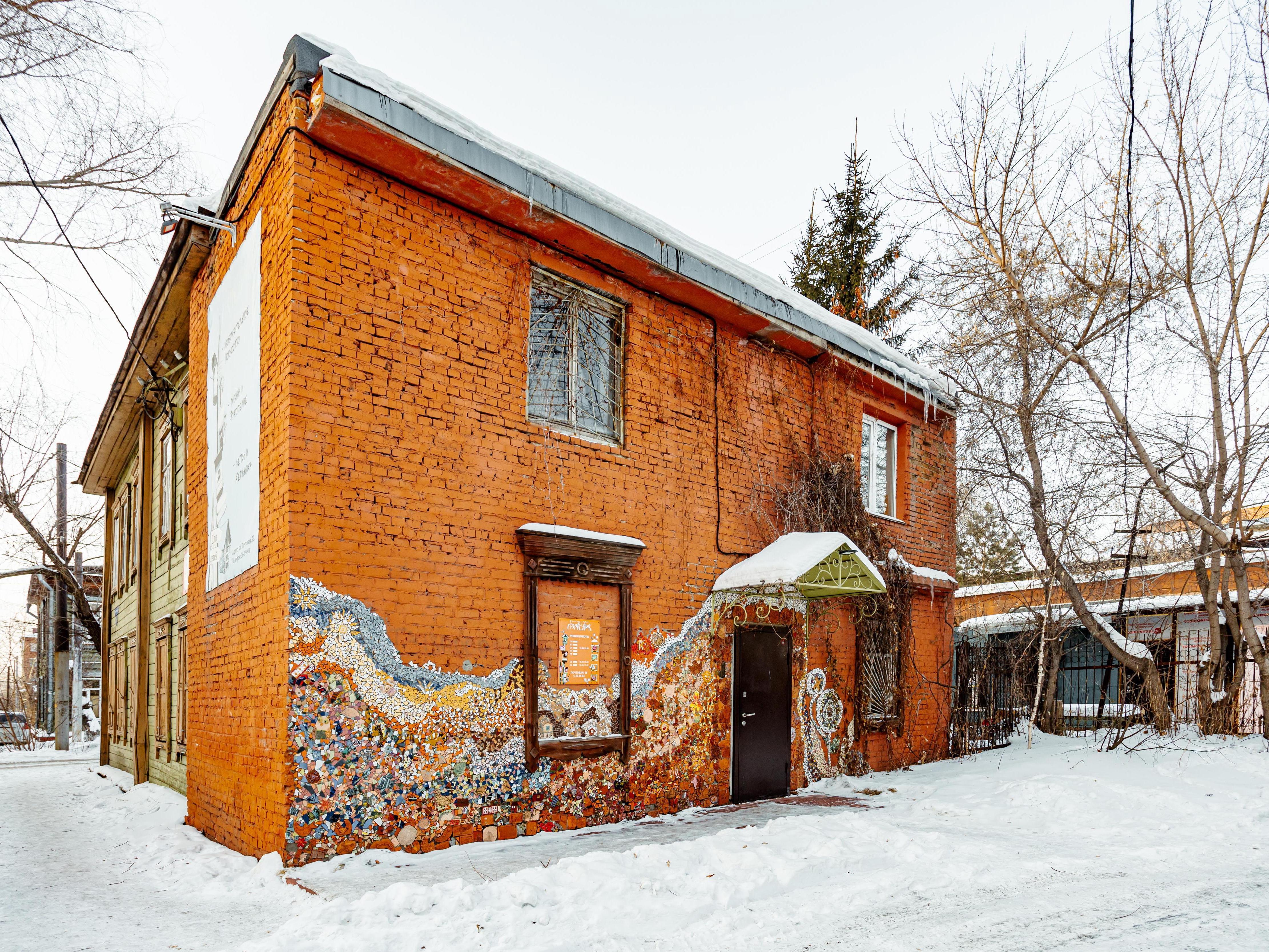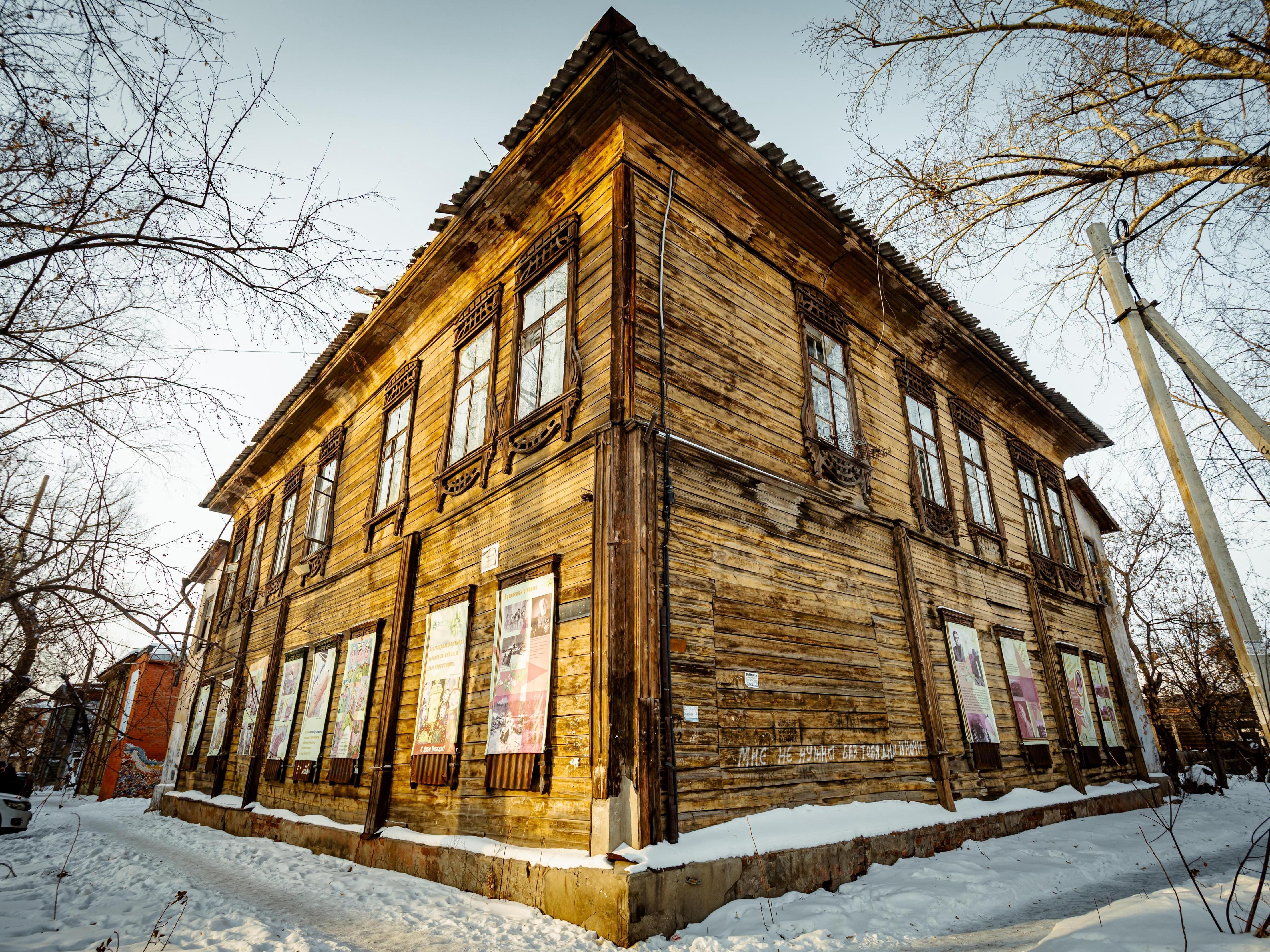 Now let«s take three steps to the left, to house No. 35, which looks different. Also two-story, wooden, but more monolithic and solid. You can tell the houses are connected by the identical window frames. The main difference is that someone is looking after it. The windows are clean, the roof is in order, no trash at the entrance. And that»s indeed the case: the house houses the children«s art studio »Skvorechnik« (Birdhouse).