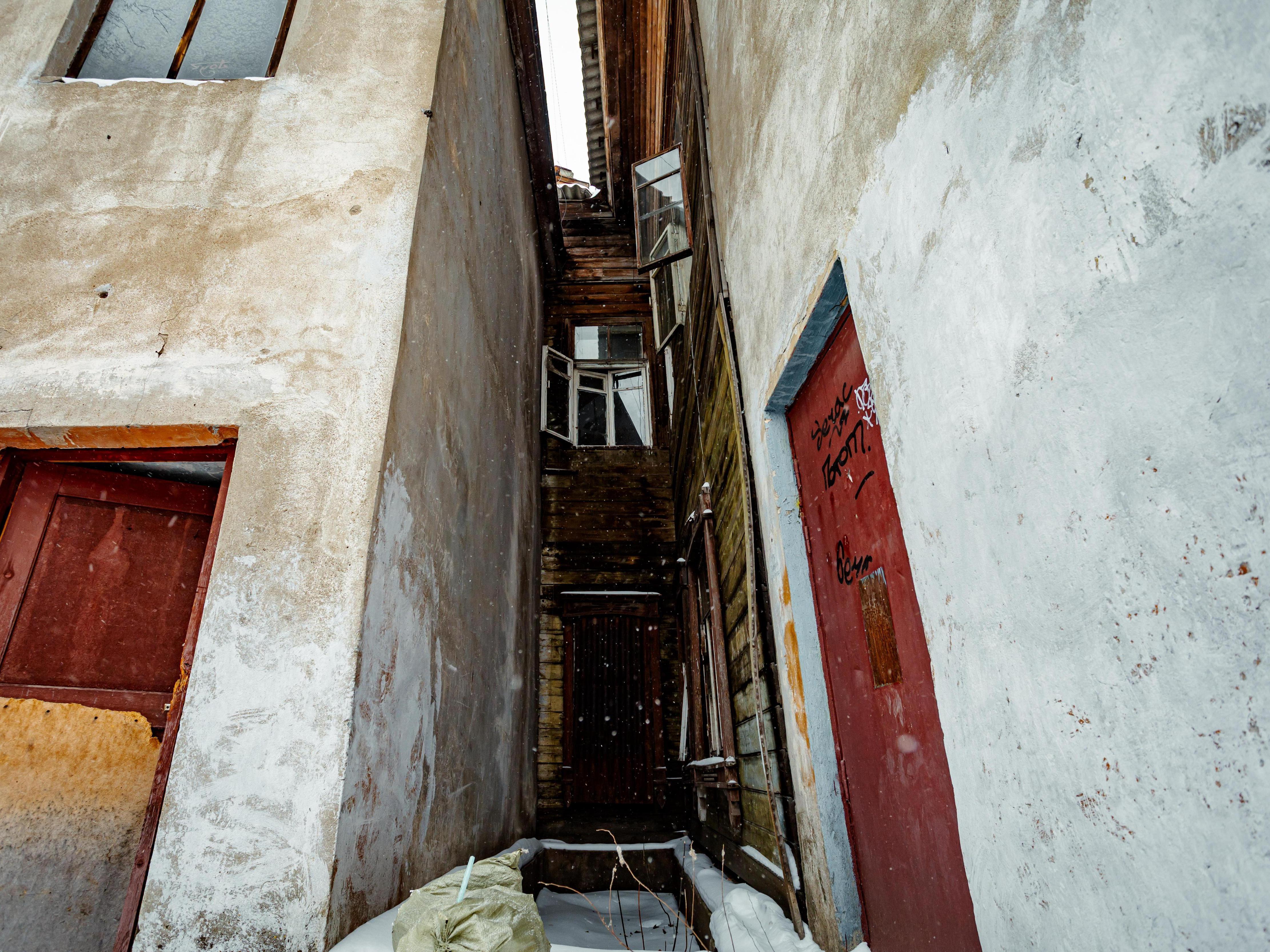 The gaze snatches from the dimness bare walls covered with obscene graffiti, holes in the ceilings, and beams sticking out like ribs. The bathroom is a surreal installation of a broken toilet and peeling tiles. Climbing the stairs, you realize that only a skeleton remains of the former comfort.