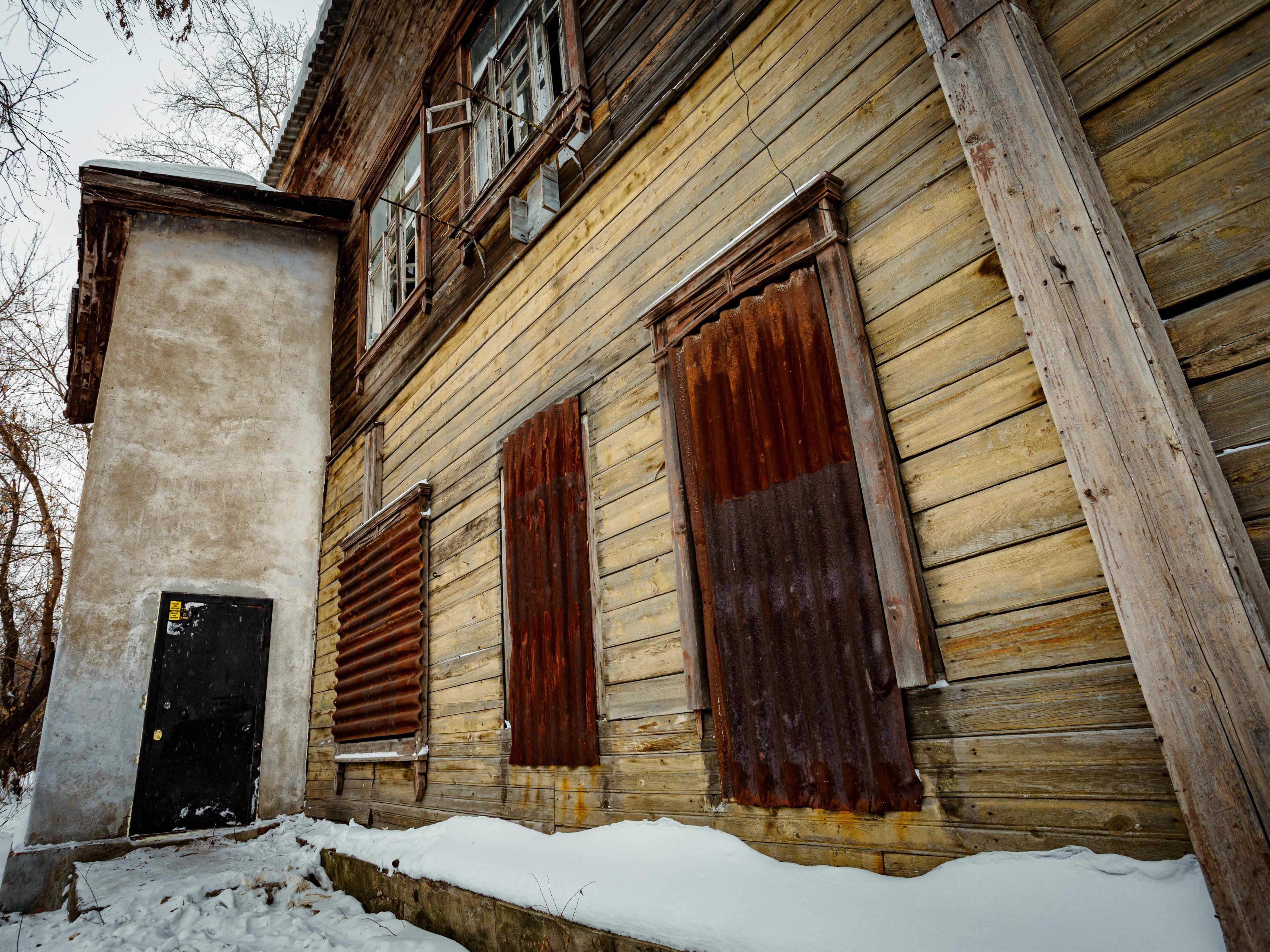 The two-story house at Pochtovaya, 37 is not just old — it is sick. The windows are broken, the wood of the facade has blackened and cracked, and the once-beautiful carved window frames with a barely perceptible solar symbol seem not like decoration but a last plea for help.