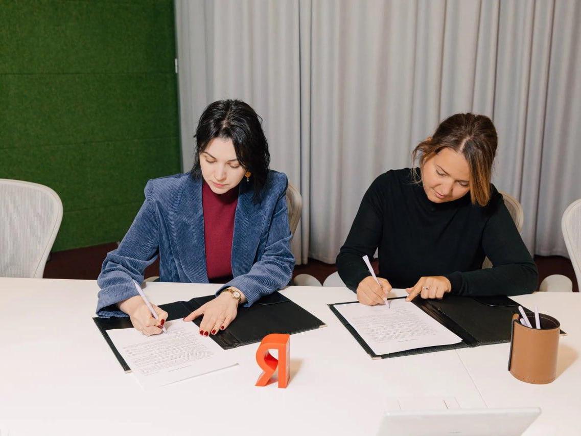 Senior representatives from Yandex and TOCHNO Group formalize the smart building partnership agreement.