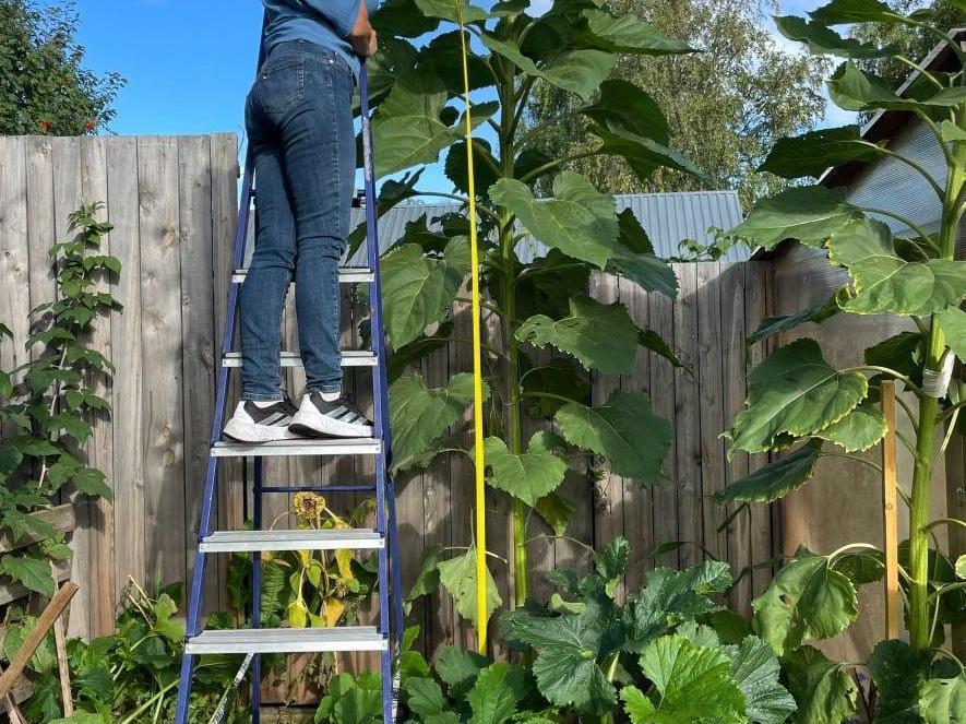 «The sunflower basically grew on its own; no one really tended it, — the Yugra resident said. — The seedlings were spindly and weak, so I wasn’t counting on a result; I didn’t place any bets. But at some point it took off. Possibly because we planted it on the compost heap. Now it has shot up to almost 3 meters (about 9 ft 10 in), and the stalk is as thick as a wrist. Its seeds are white-and-black, but they’re not ripe yet. We’re waiting.»