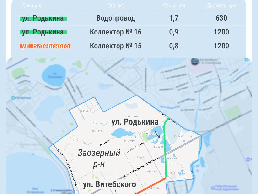 To increase the throughput capacity of the utilities and improve network reliability, 1,700 meters of water supply pipe with a diameter of 630 mm on Rodkina Street are being replaced. In the same area, near microdistrict 11, sewer collector No. 16 is being relaid. The length of the renewed section will be over 900 meters, and the diameter of the new collector is 1,200 mm.
