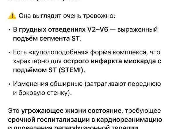 The ECG from the first crew, Natalia and her son uploaded into ChatGPT. The machine ‘read’ signs of a myocardial infarction on the cardiogram and strongly recommended urgent hospitalization.