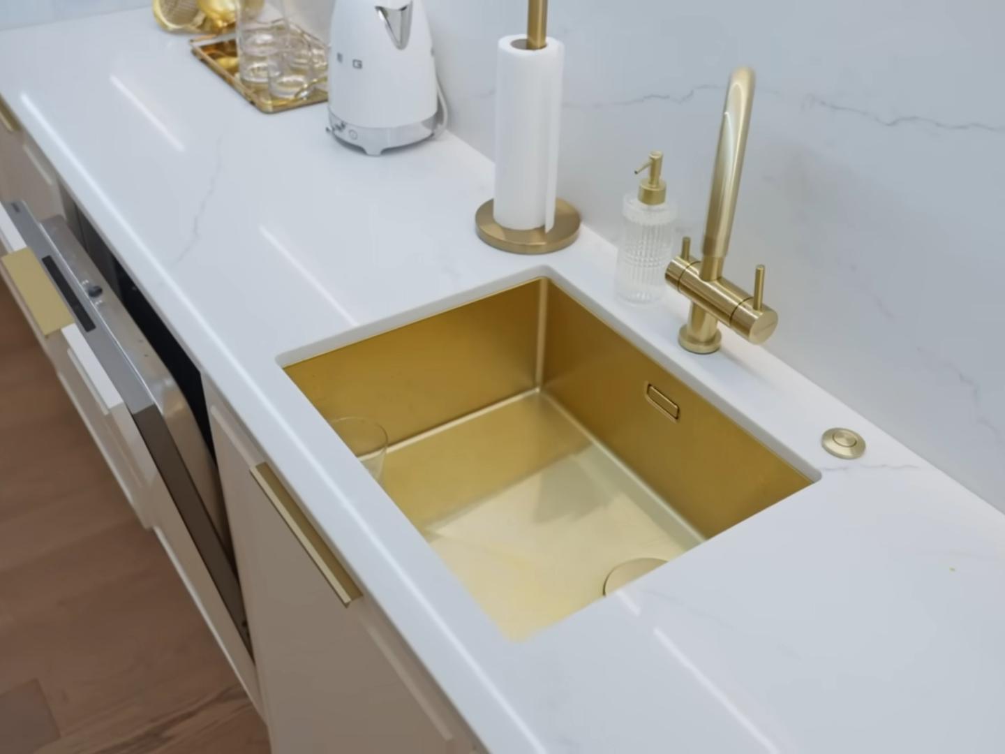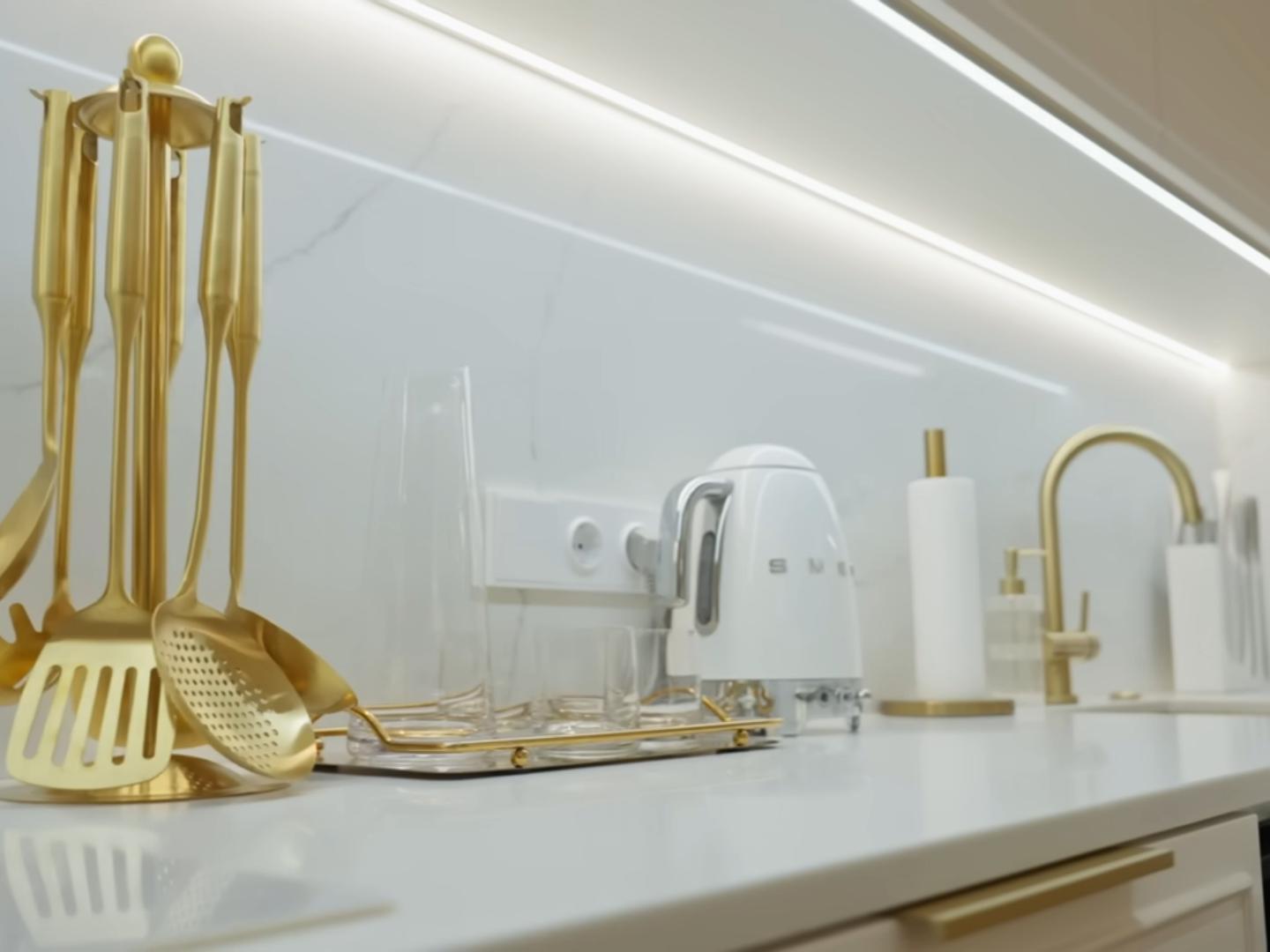 Alexey does not hide that he had urges to make the home “rich and luxurious,” but he stopped himself and added only touches of brass and gold to the interior. For example, on floor lamps, candlesticks, and dishes. And also on the kitchen sink.